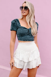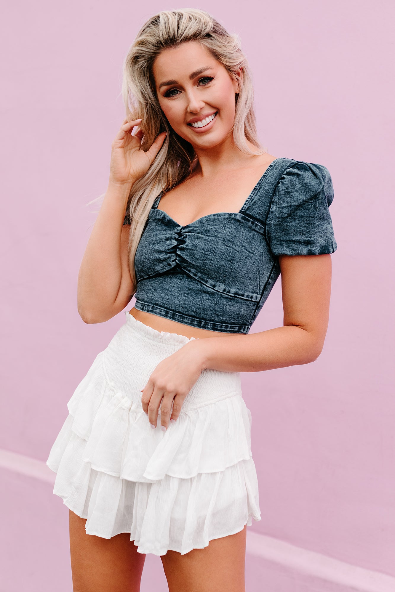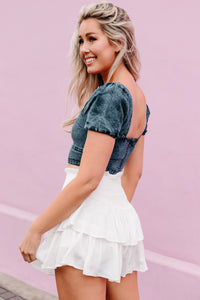 There's No Question That You'll Love This Sweetheart Neck, Puff Sleeved, Denim Crop Top!