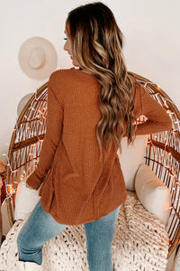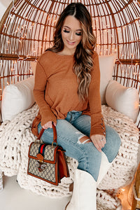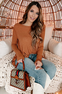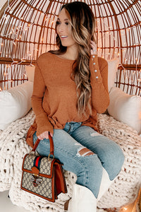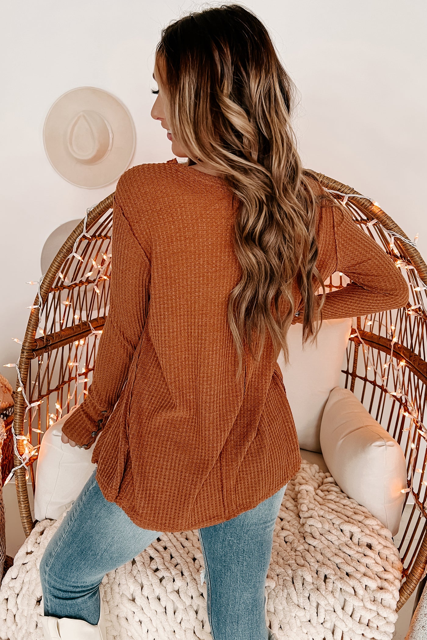 The Raw Edge Trim & Button Detailed Cuffs Make This Pumpkin, Waffle Knit Top The Perfect Casual Top!