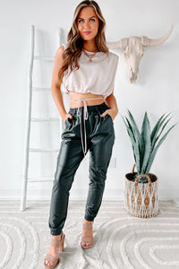 Acting Up High Waisted Faux Leather Joggers (Black)