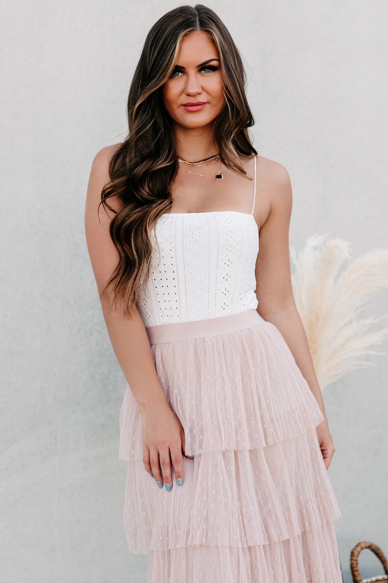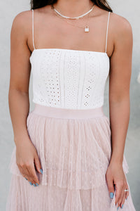 You'll fall in love with this white eyelet lace bodysuit, with a square neckline & stretchy thin straps!