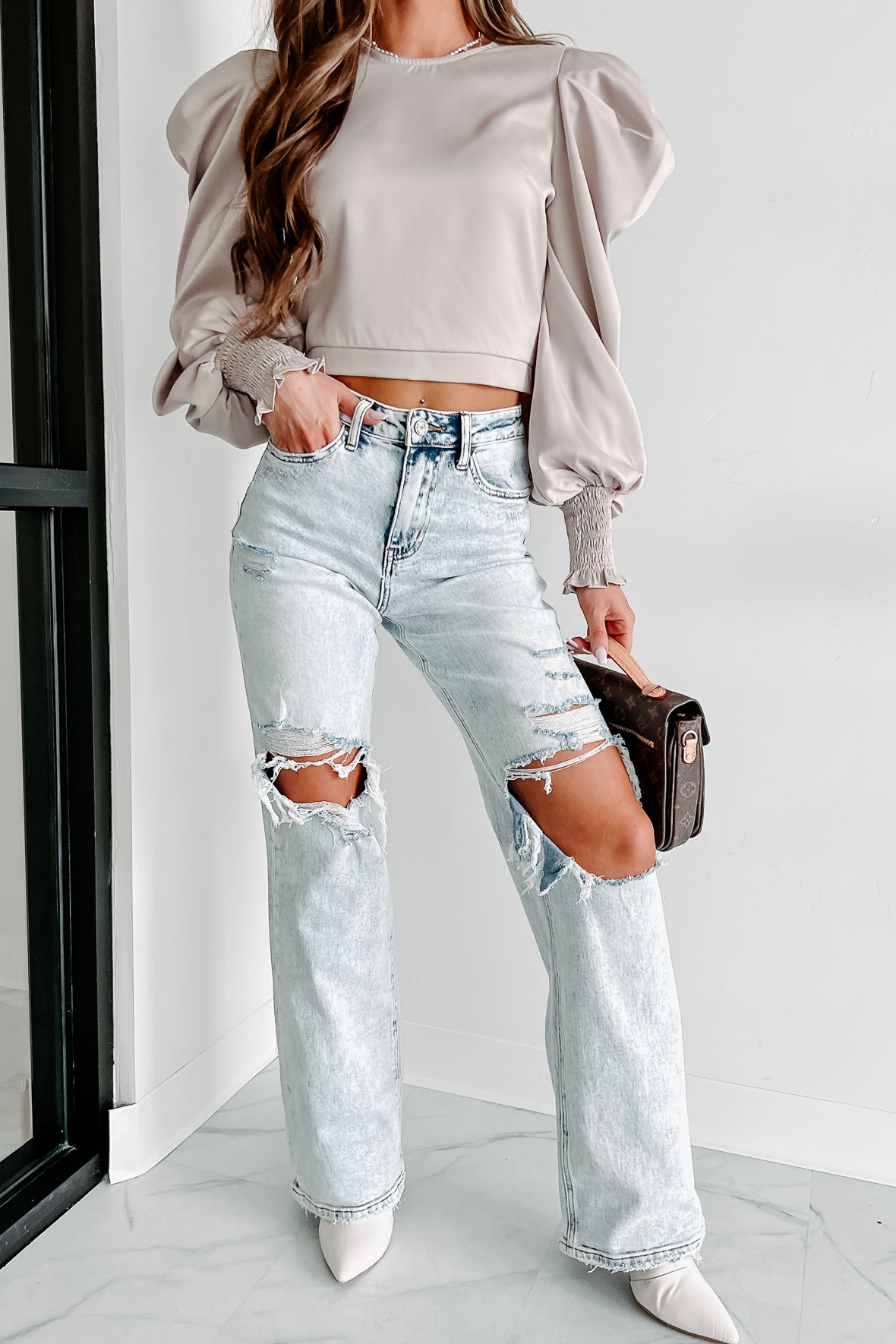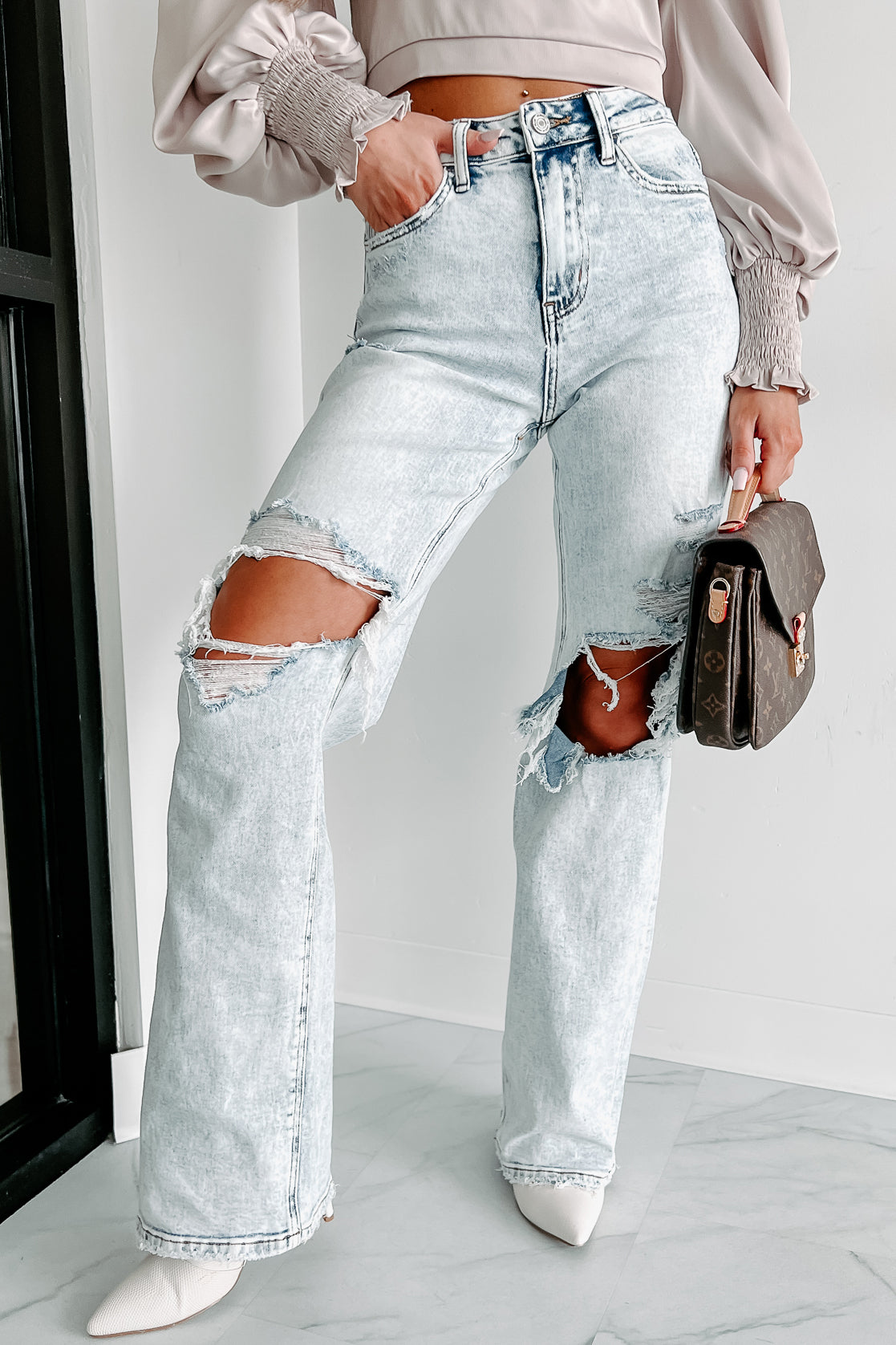 Step into the '90s with these vintage-inspired flying monkey jeans! With a light acid wash and distressed knees, their high-waisted fit gives you that classic flare to style up your look!