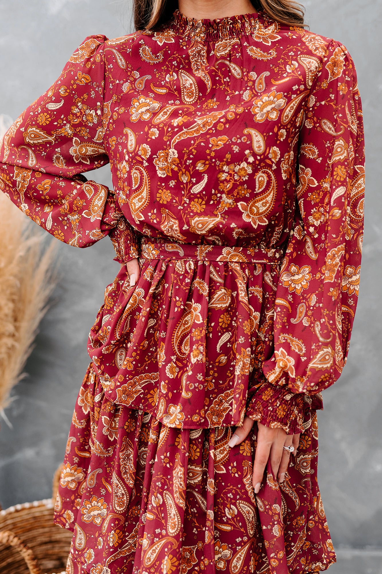 Be Memorable In This Burgundy, Paisley Printed, Long Sleeved, Tiered Maxi Dress!