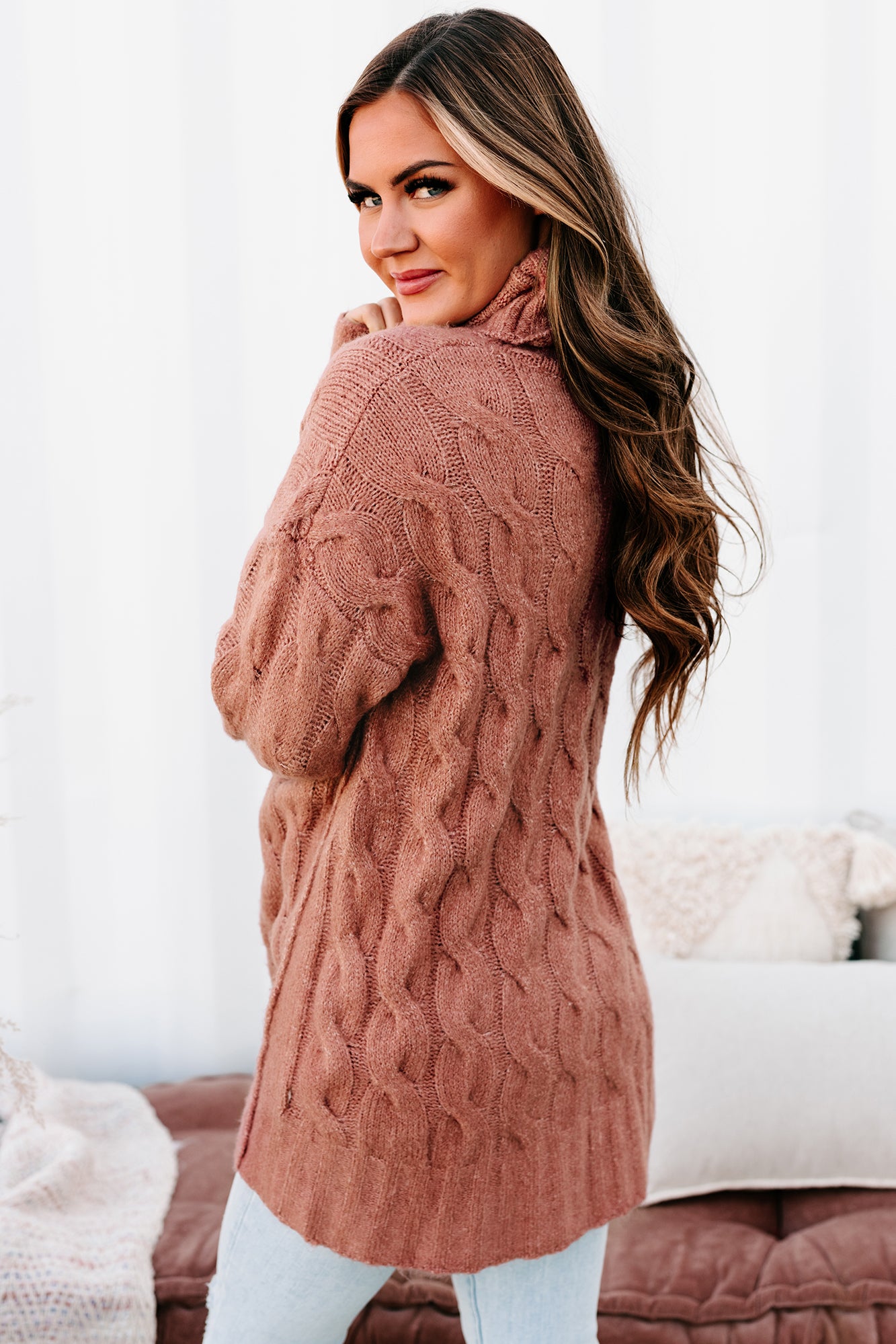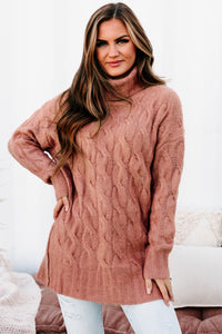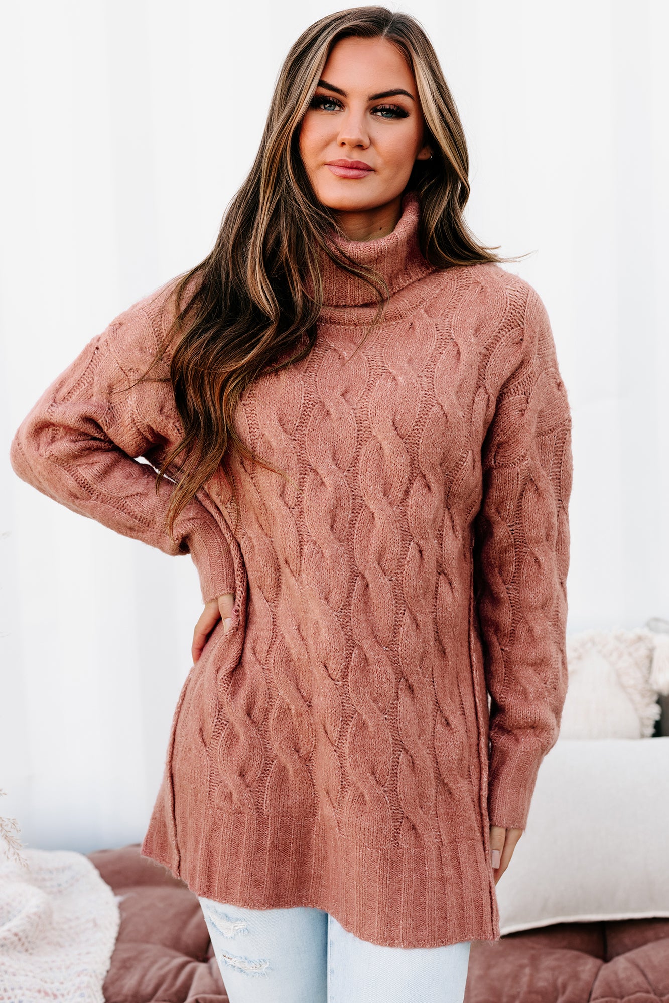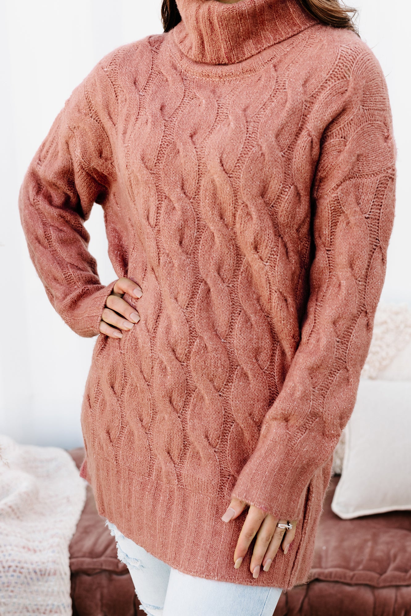 Stay Cozy & Cute In This Rosewood, Turtle Neck, Cable Knit, Sweater Tunic! Wear It As A Dress Or Top!