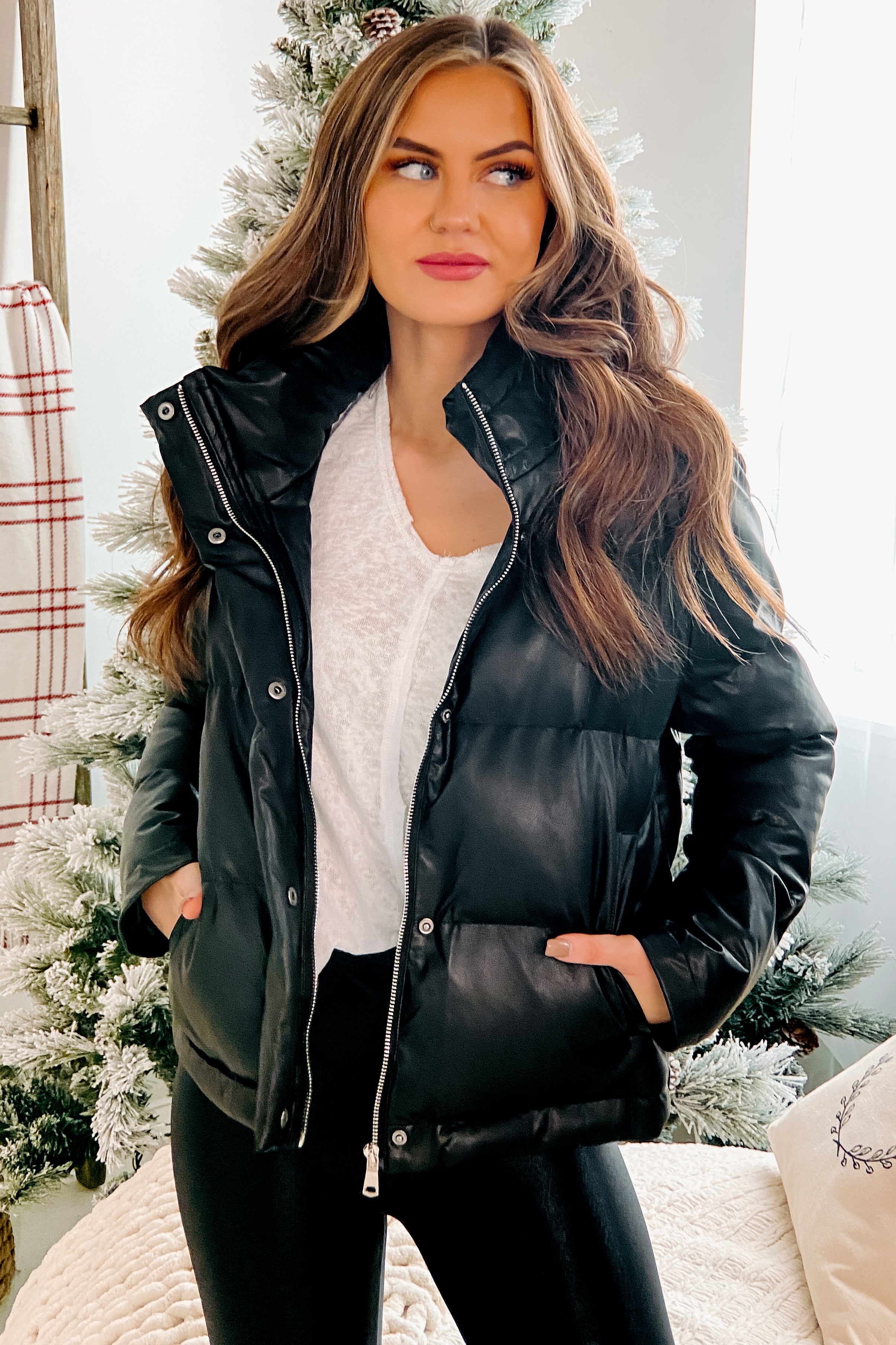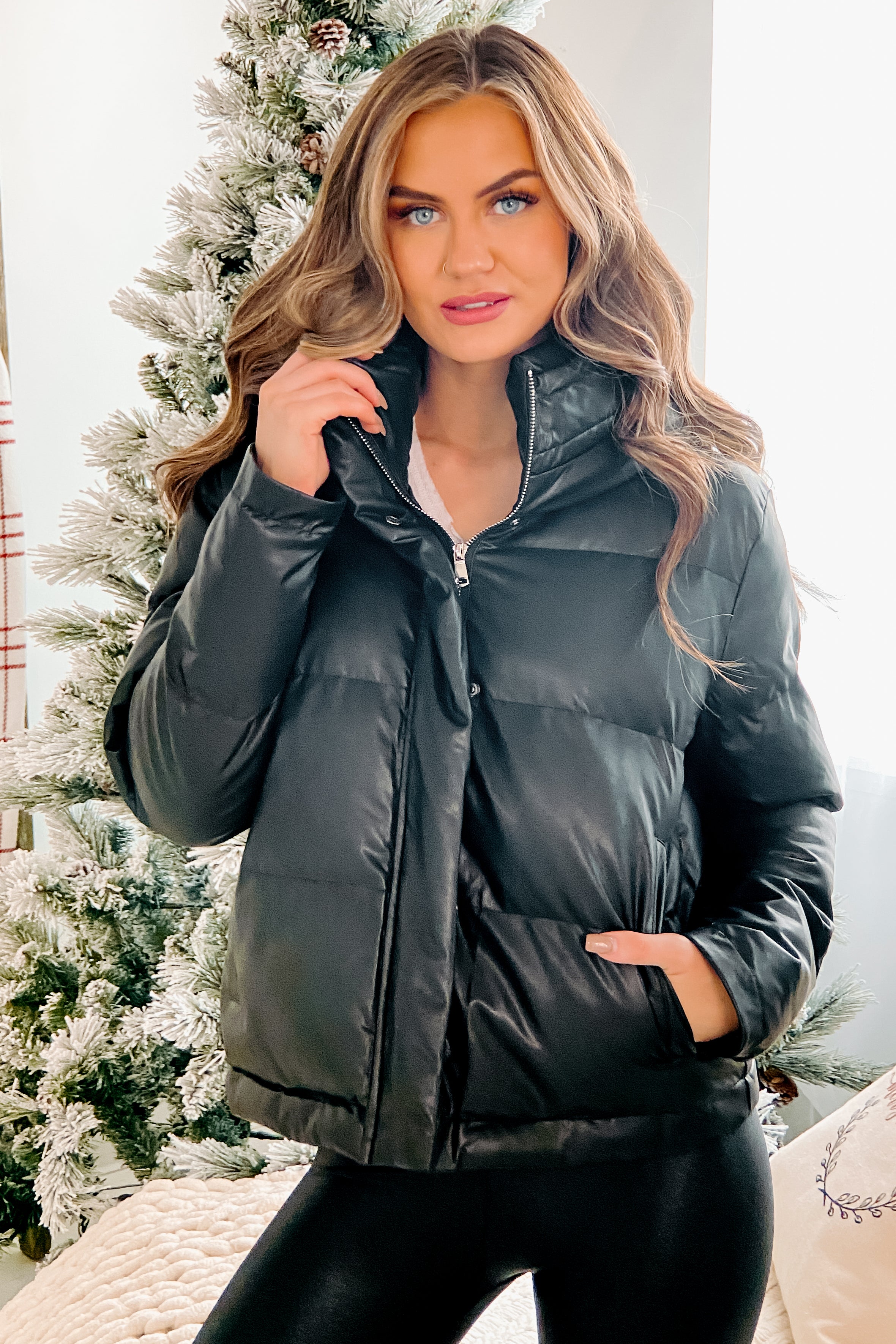 Be Chic & Trendy This Winter In This Black, Faux Leather, Puffer Coat!