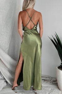 Beautiful Words Lace Trim Satin Maxi Dress (Olive Green)