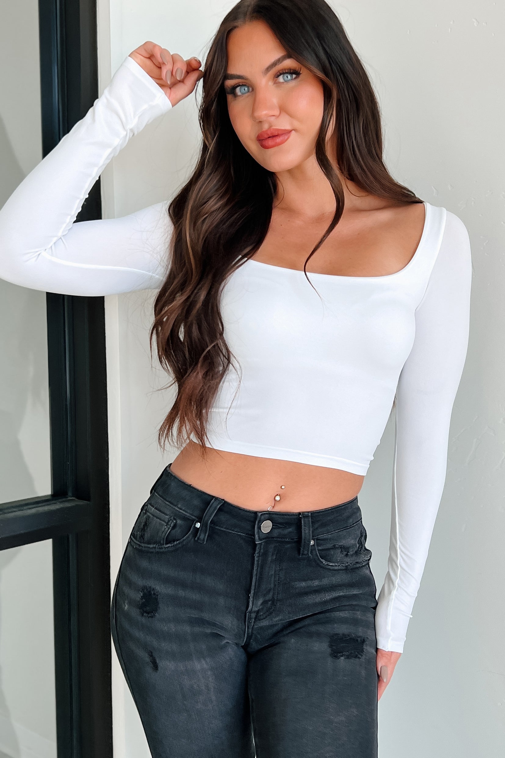 Better Be Sure Square Neck Long Sleeve Crop Top (White) - NanaMacs