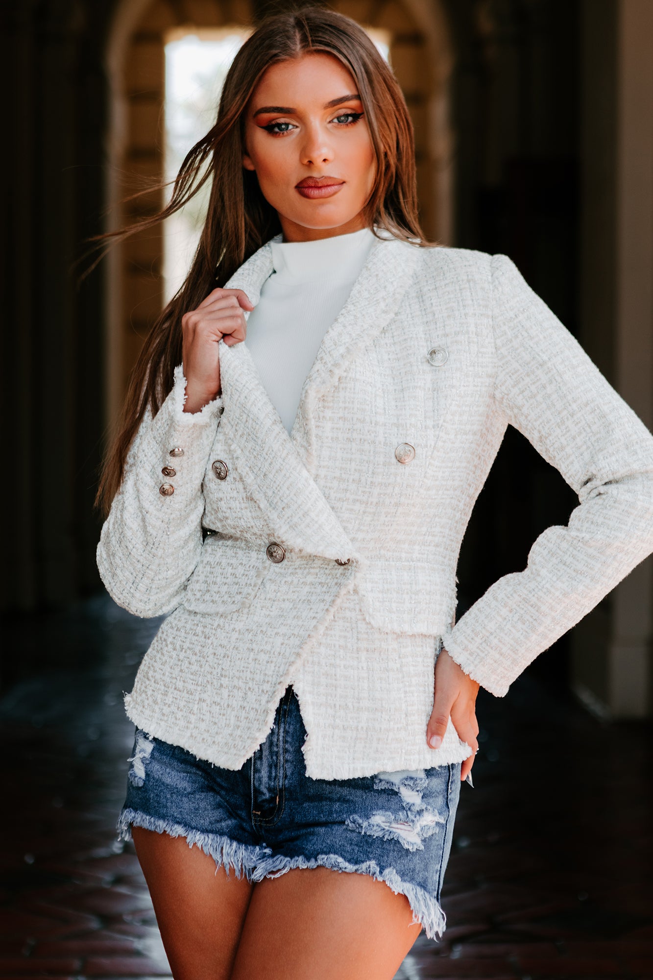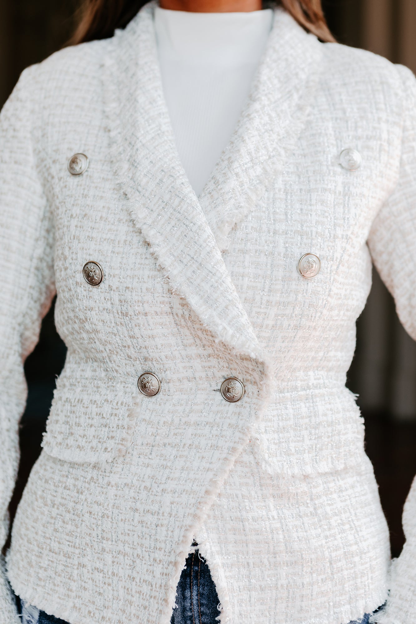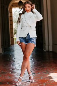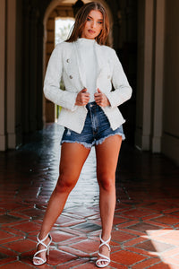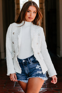 Look Successful In This Ivory/Silver, Fringed Tweed Blazer!