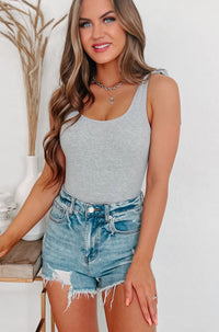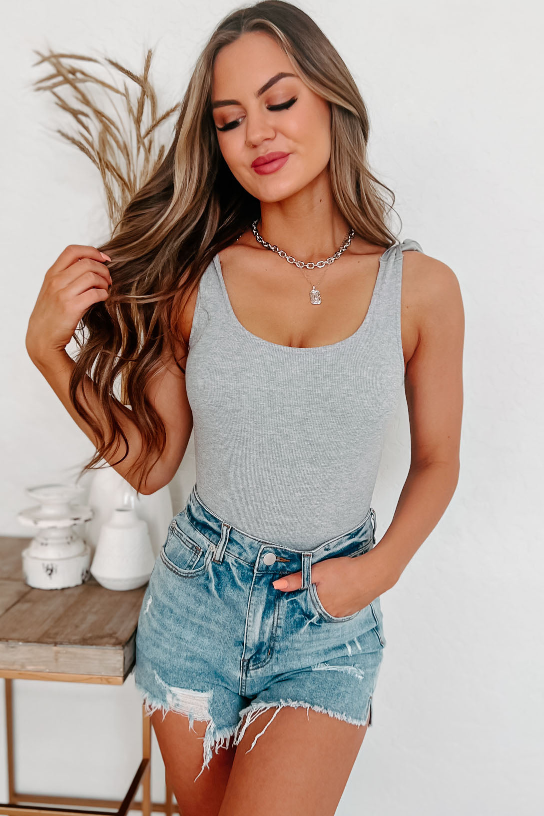 This Heather Grey, Tie-Shoulder Bodysuit Is Casual And Perfect For Spring And Summer!