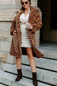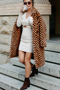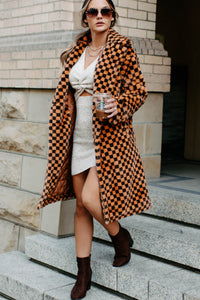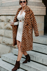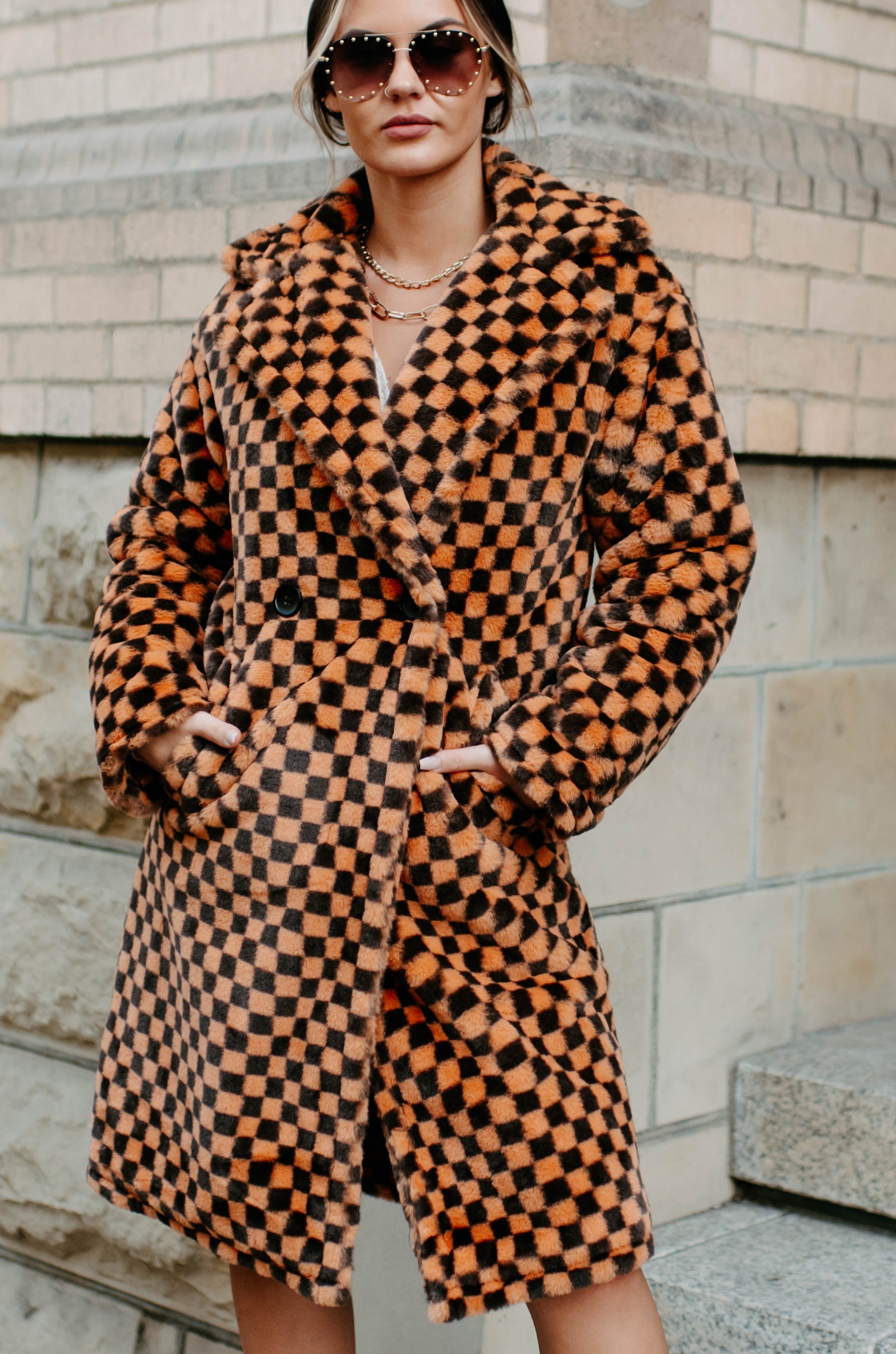 Call My Lawyer Checkered Faux Fur Coat (Brown & Orange) - NanaMacs