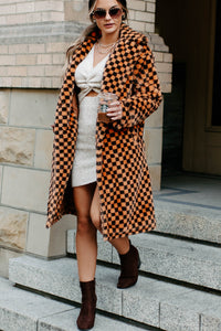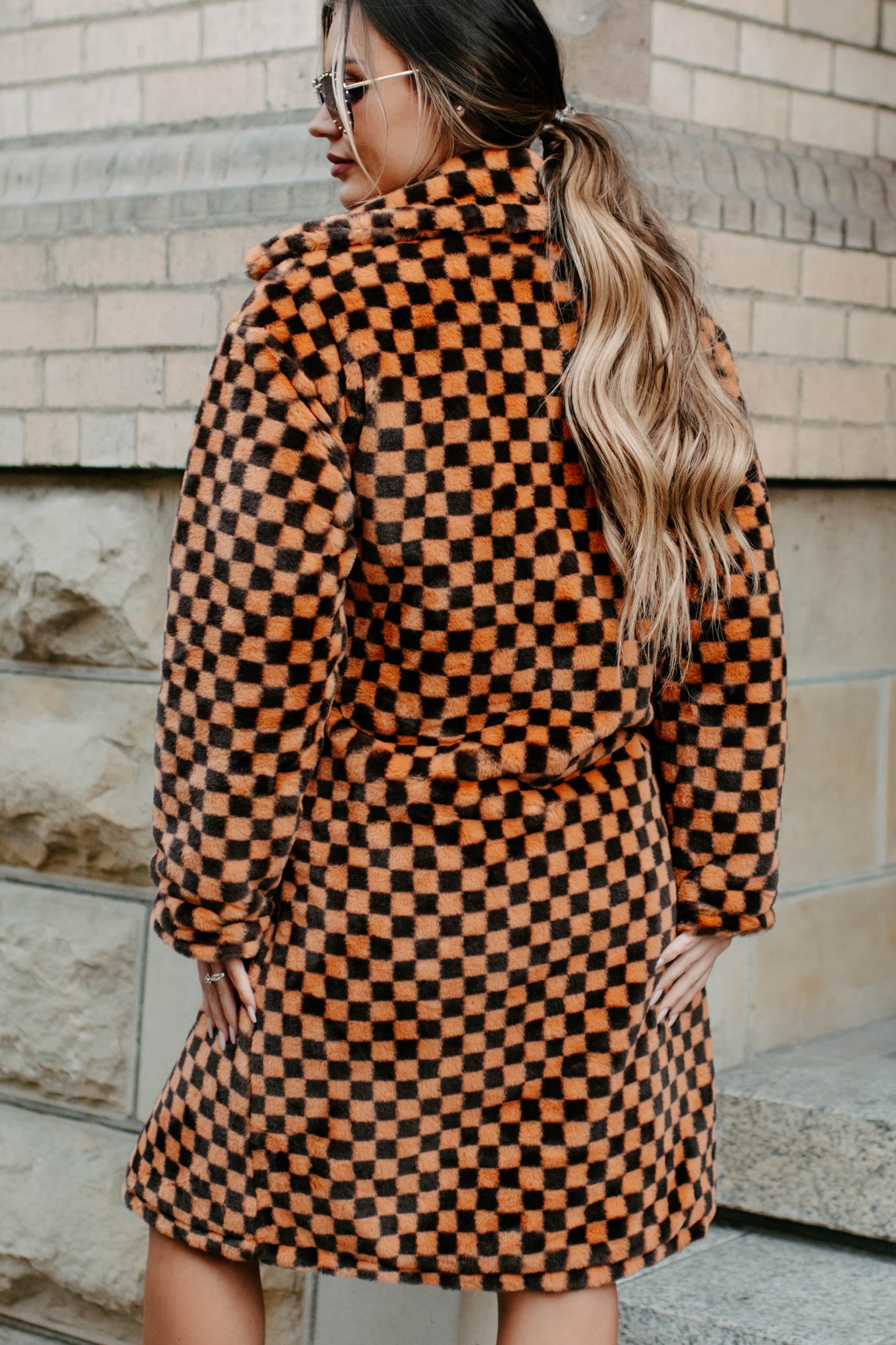Call My Lawyer Checkered Faux Fur Coat (Brown & Orange)