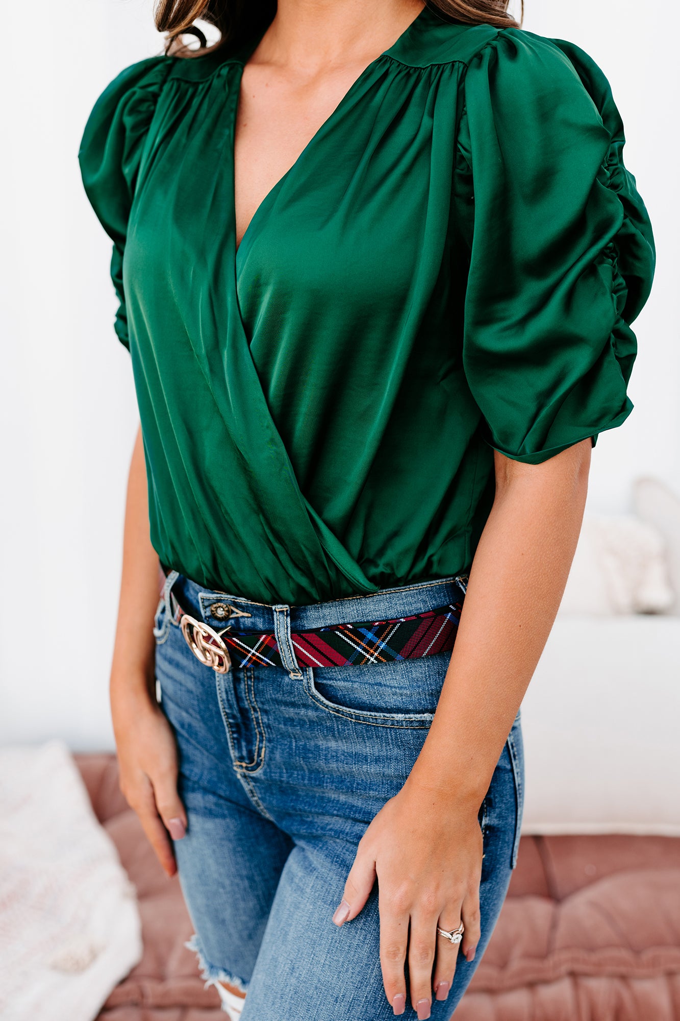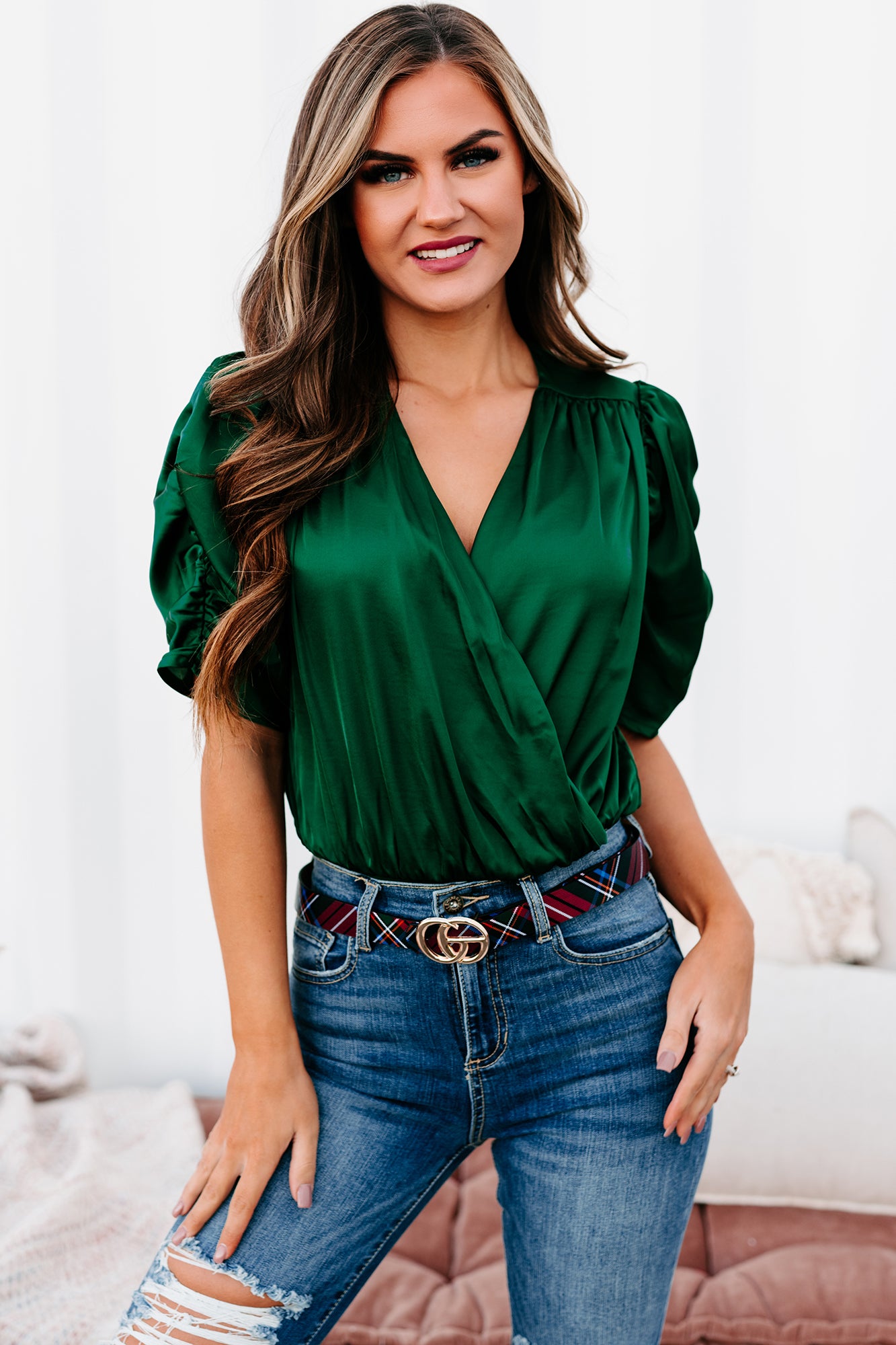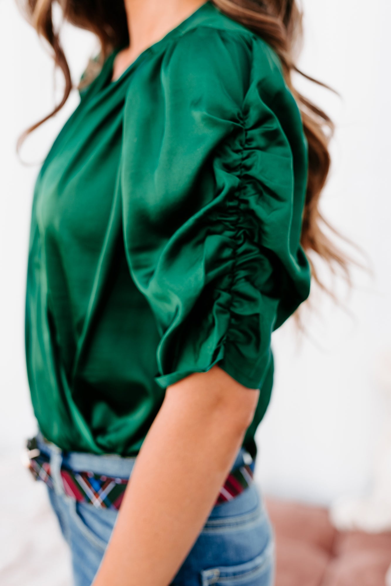 Look Sleek & Stylish In This Hunter Green, Satin, Ruched Sleeve, Surplice Bodysuit!
