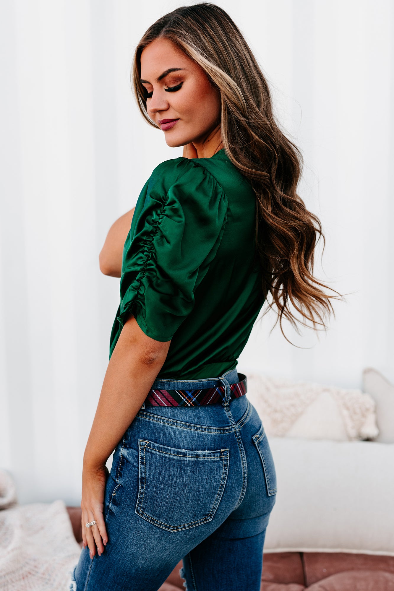Can't Quit You Satin Ruched Sleeve Bodysuit (Hunter Green) - NanaMacs