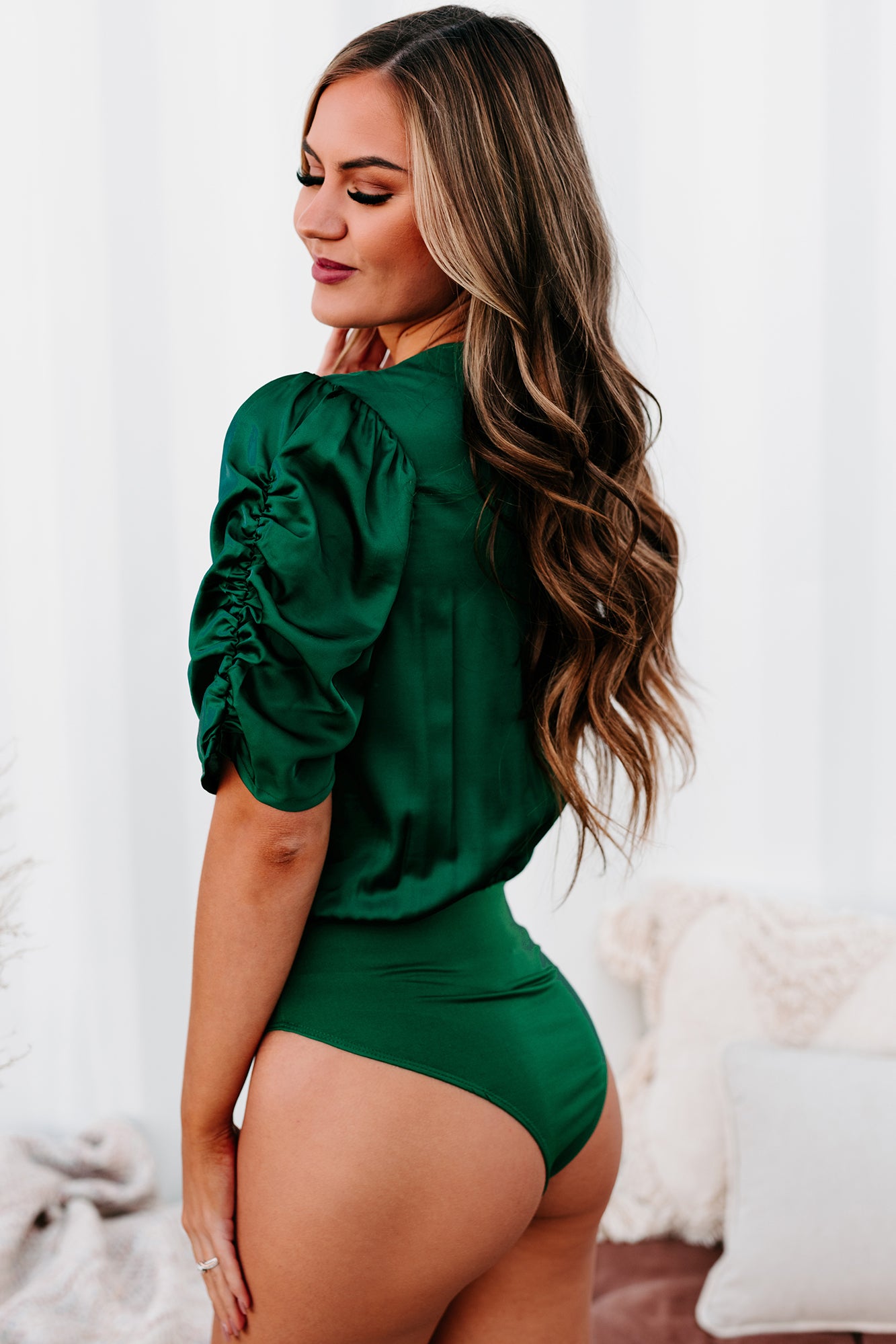 Can't Quit You Satin Ruched Sleeve Bodysuit (Hunter Green)