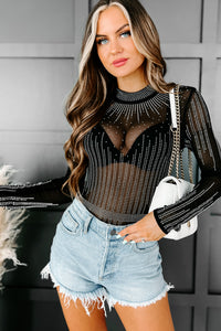 Chasin' Cowboys Long Sleeve Rhinestone Mesh Bodysuit (Black/Silver)