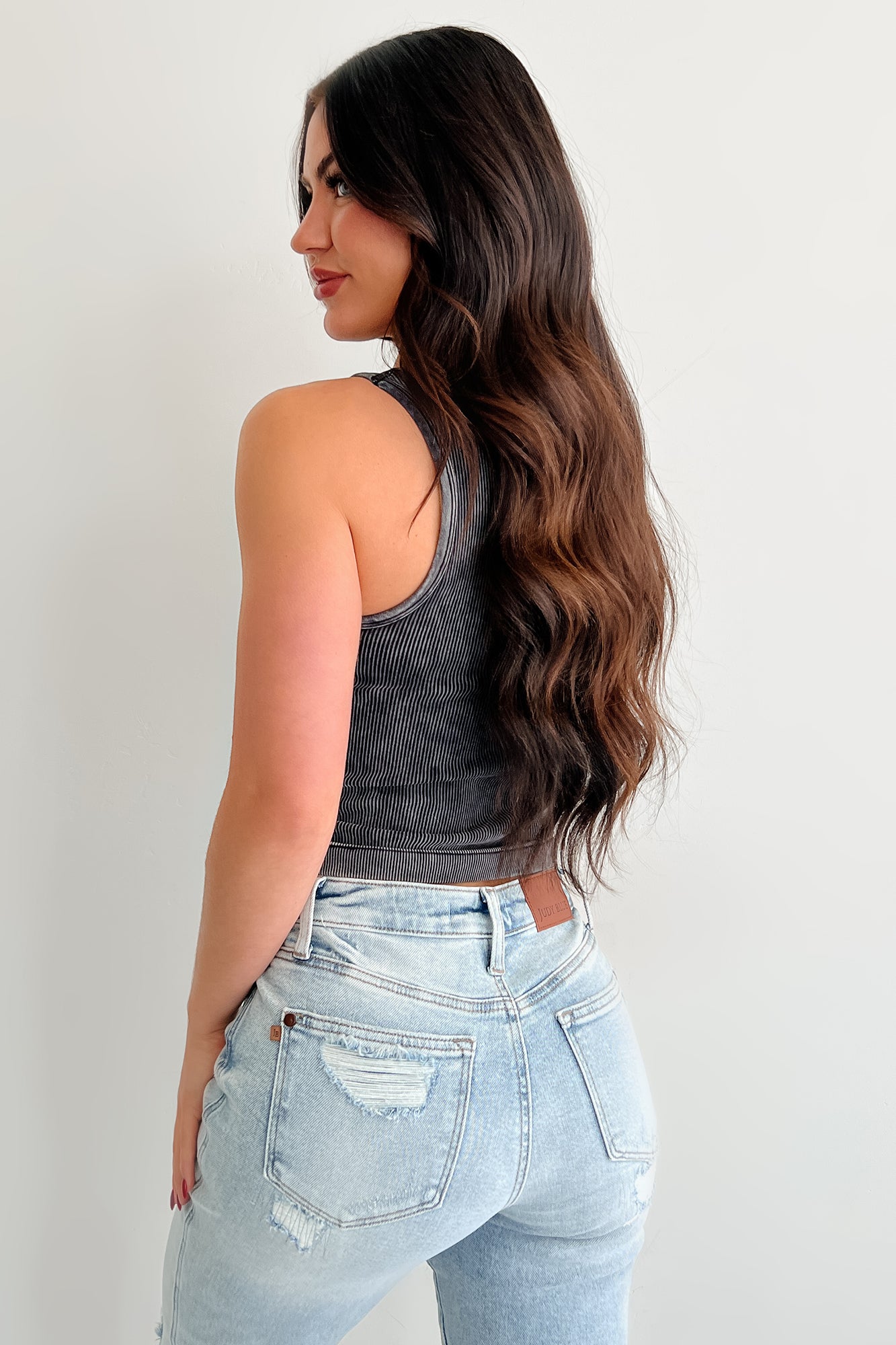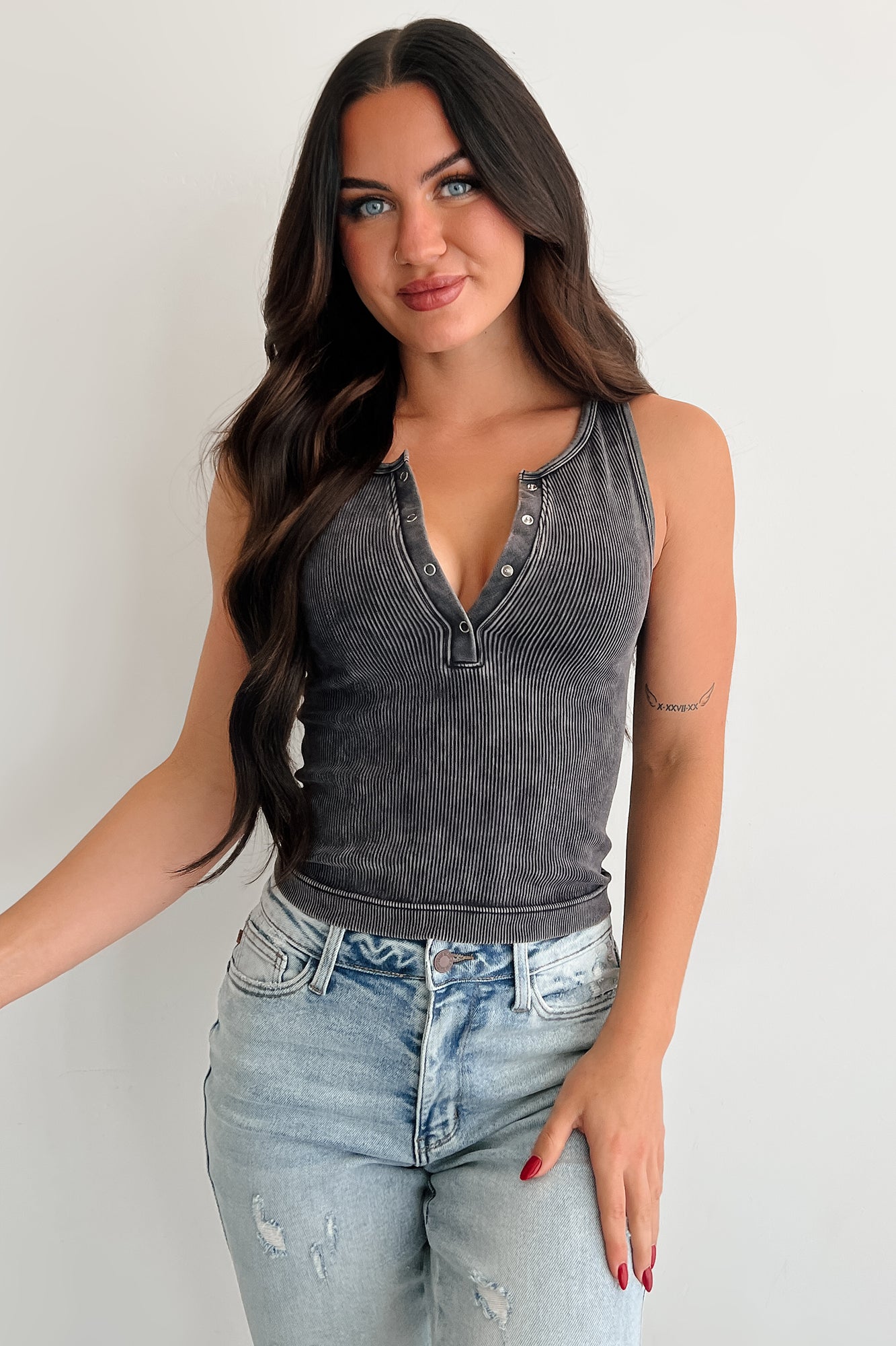 Chill Intentions Ribbed Washed Zenana Henley Tank (Ash Black) - NanaMacs
