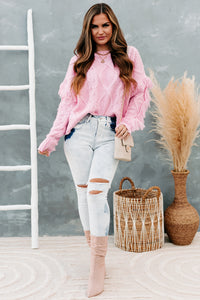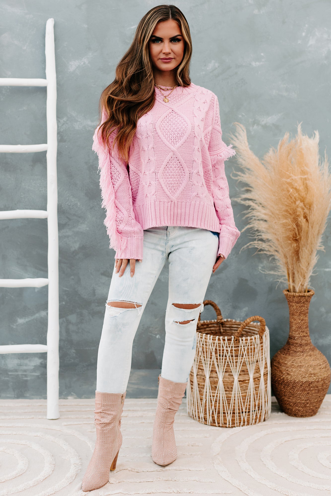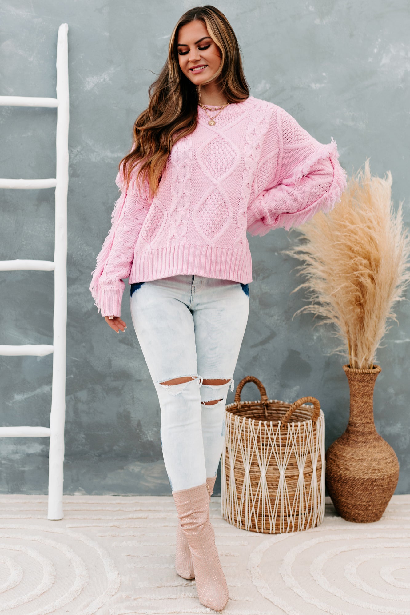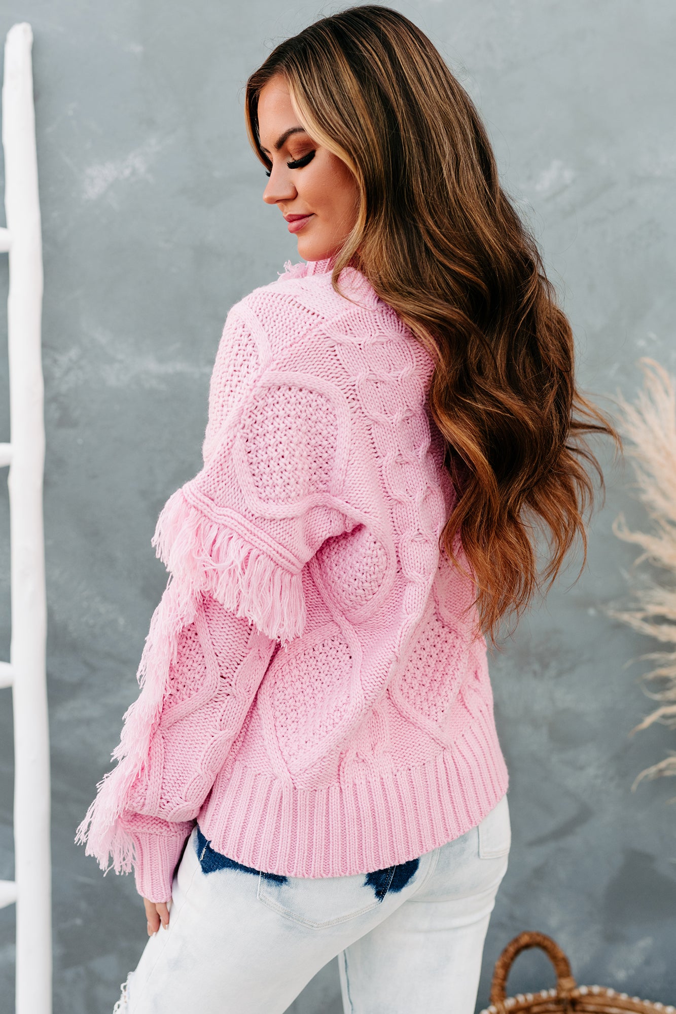 Chilly Greetings Fringe Sleeve Cable Knit Sweater (Pink) - NanaMacs