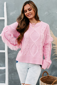 Chilly Greetings Fringe Sleeve Cable Knit Sweater (Pink)