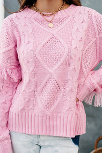 Stay Warm This Winter In This Pink, Fringe Detailed,  Cable Knit, Sweater!