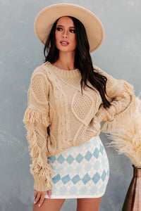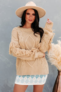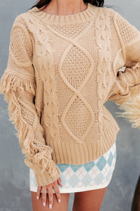 Chilly Greetings Fringe Sleeve Cable Knit Sweater (Taupe) - NanaMacs