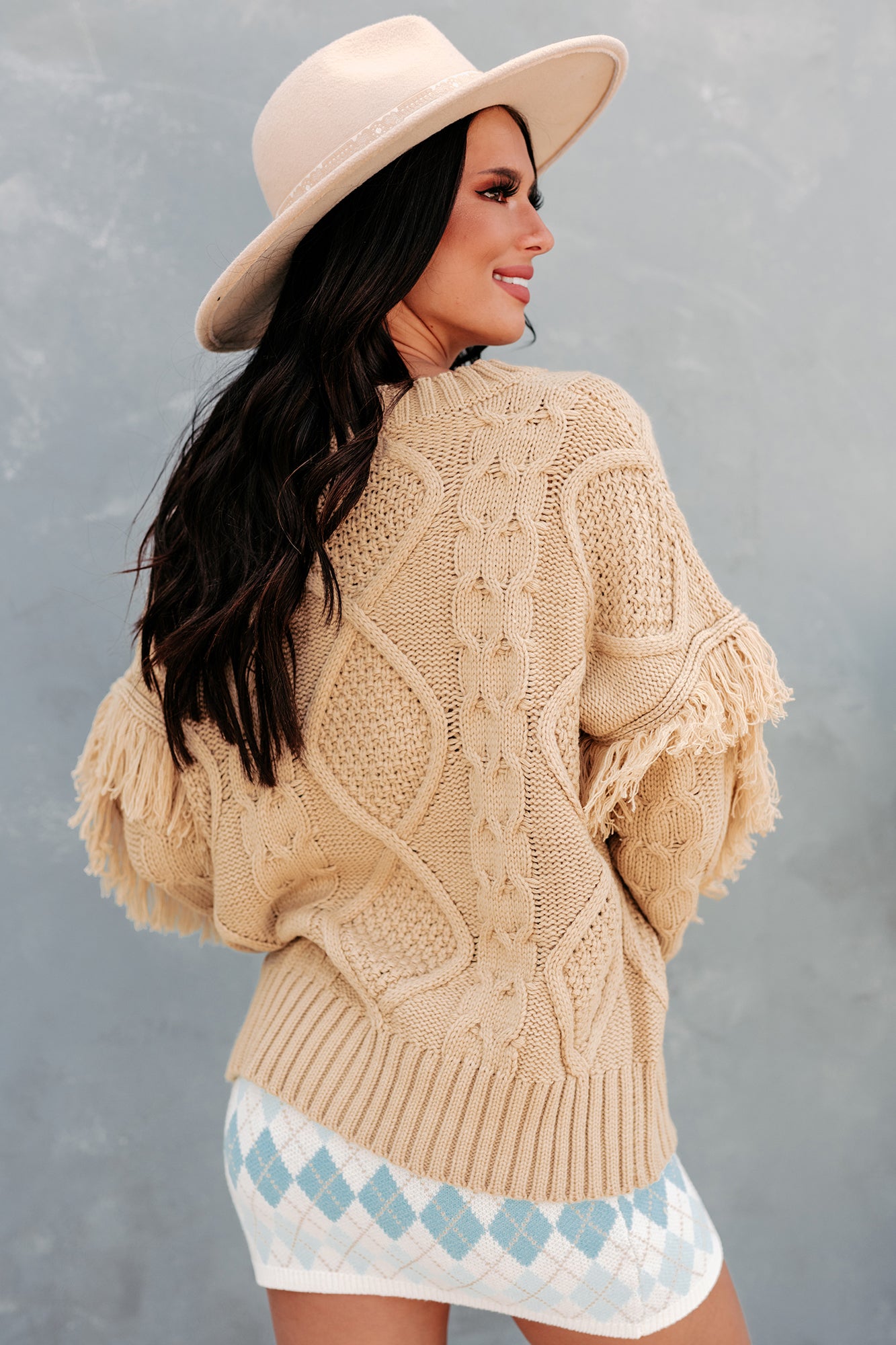 Stay Warm This Winter In This Taupe, Fringe Detailed,  Cable Knit, Sweater!