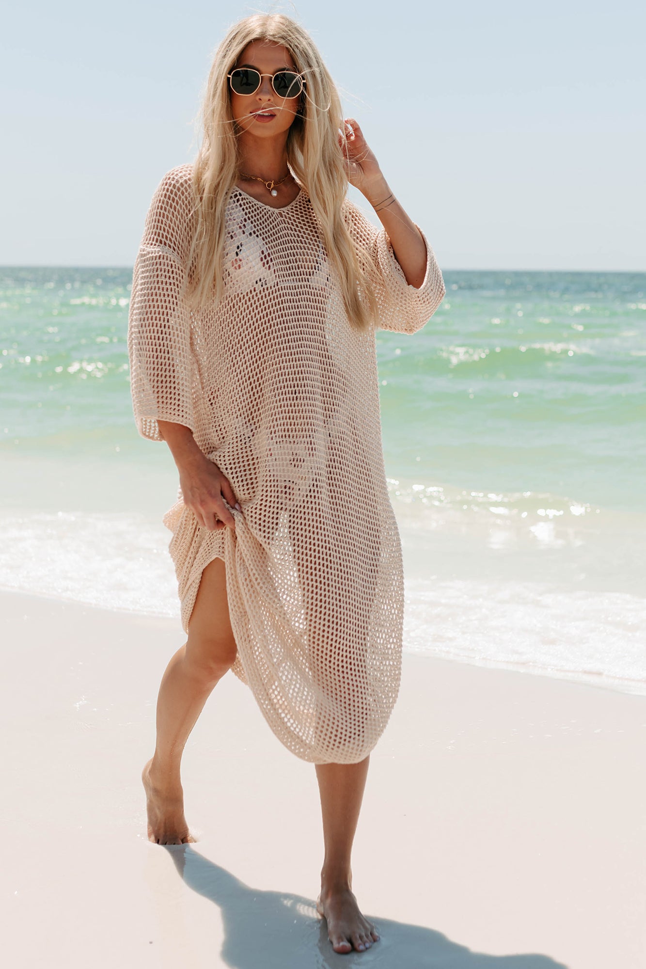 Collecting Seashells 3/4 Sleeve Crochet Swim Cover (Oatmeal) - NanaMacs