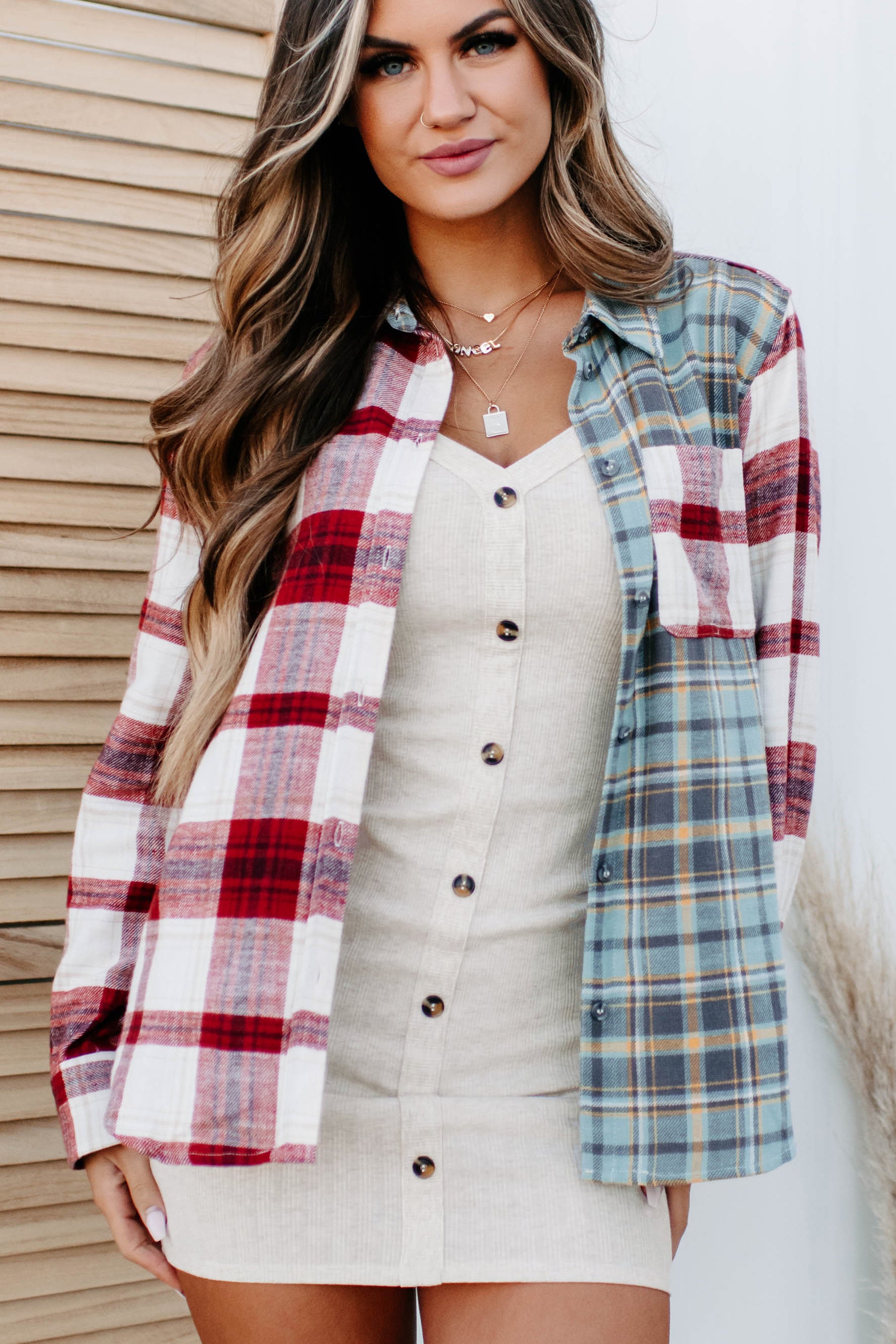 Leaves Are Falling Colorblock Plaid Button-Down Shirt (Red) - NanaMacs