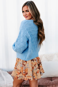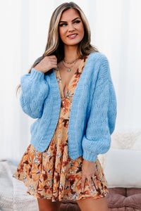 Stay Cozy In This Blue, Open Front, Balloon Sleeved, Chunky Knit Cardigan!
