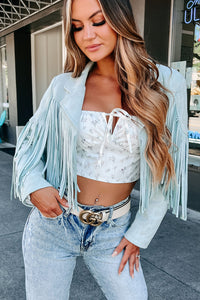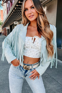 Daring Delight Faux Suede Fringe Jacket (Baby Blue)