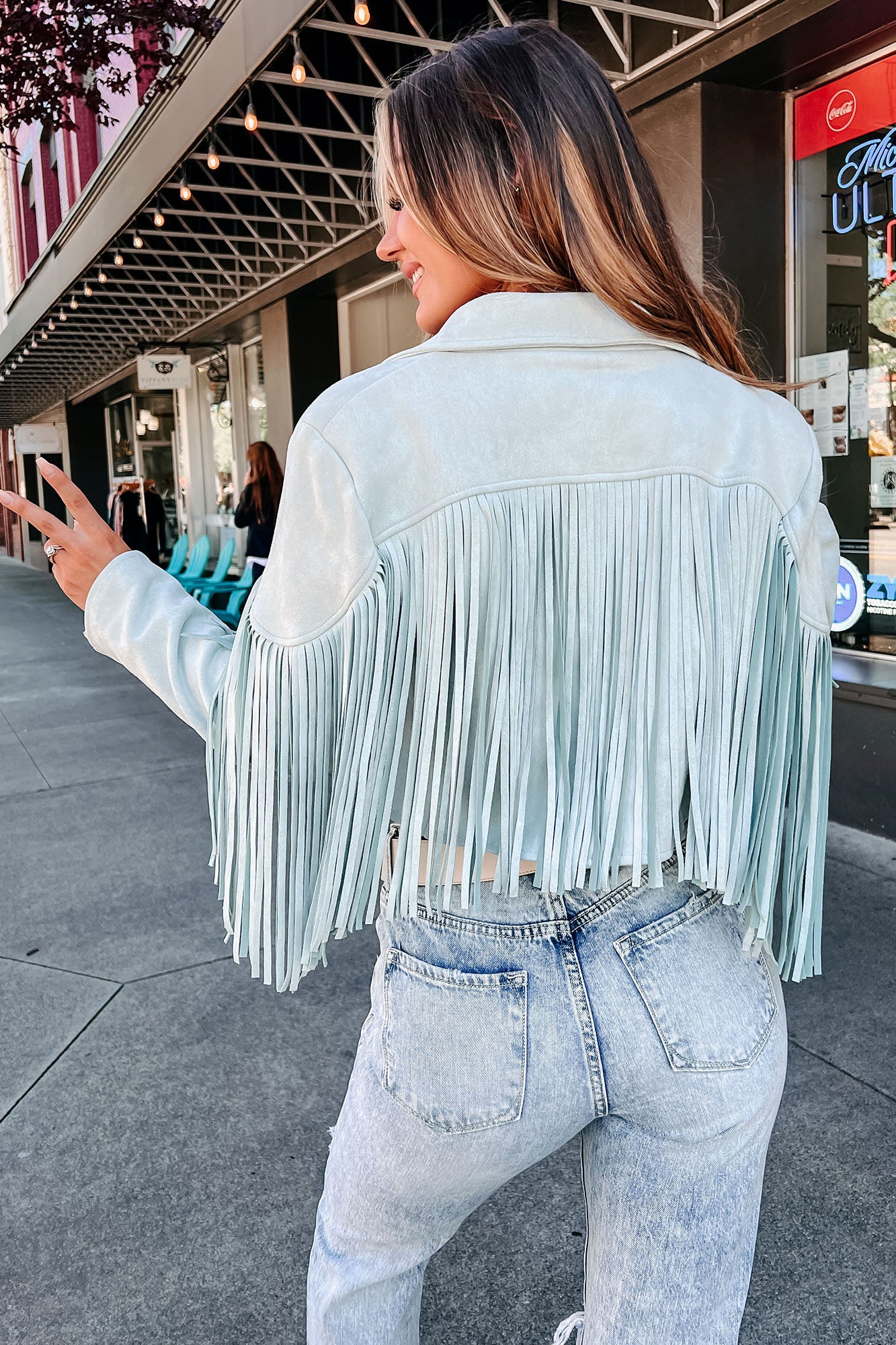Style Is Key & This Baby Blue, Faux Suede Moto Jacket Fits The Bill With Its Fringed Design & Cropped Length!