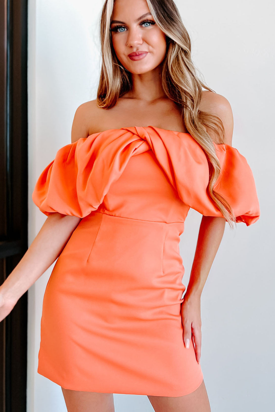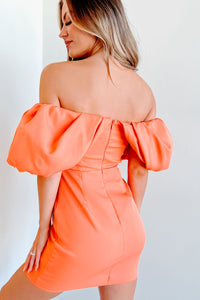 Day Dreamer Puff Of The Shoulder Mini Dress (Orange) - NanaMacs