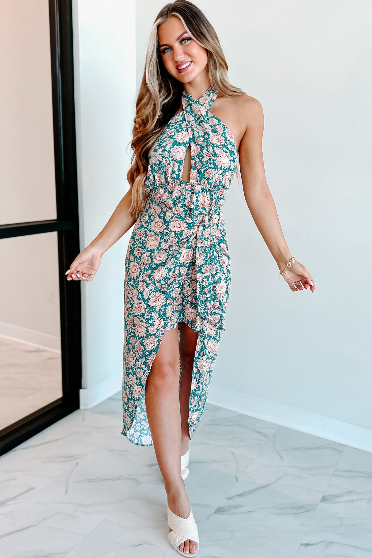 Desert Sunset Floral Halter Wrap Dress (Teal) - NanaMacs