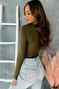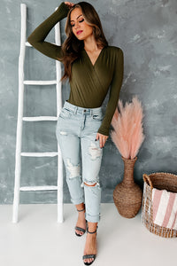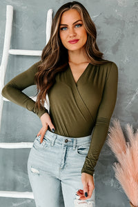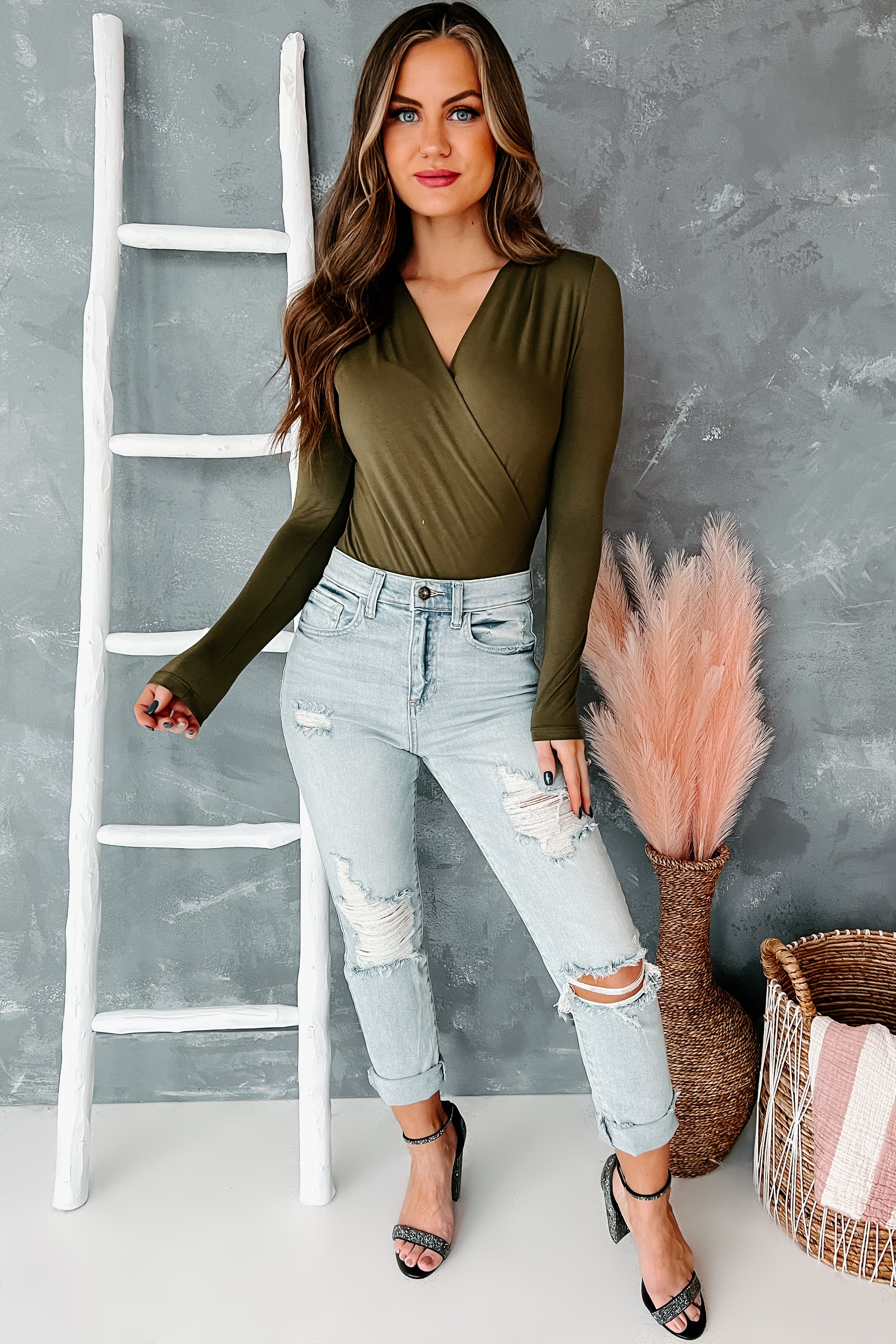 You'll Definitely Be Developing A Crush On This Olive, Long Sleeve Surplice Bodysuit!