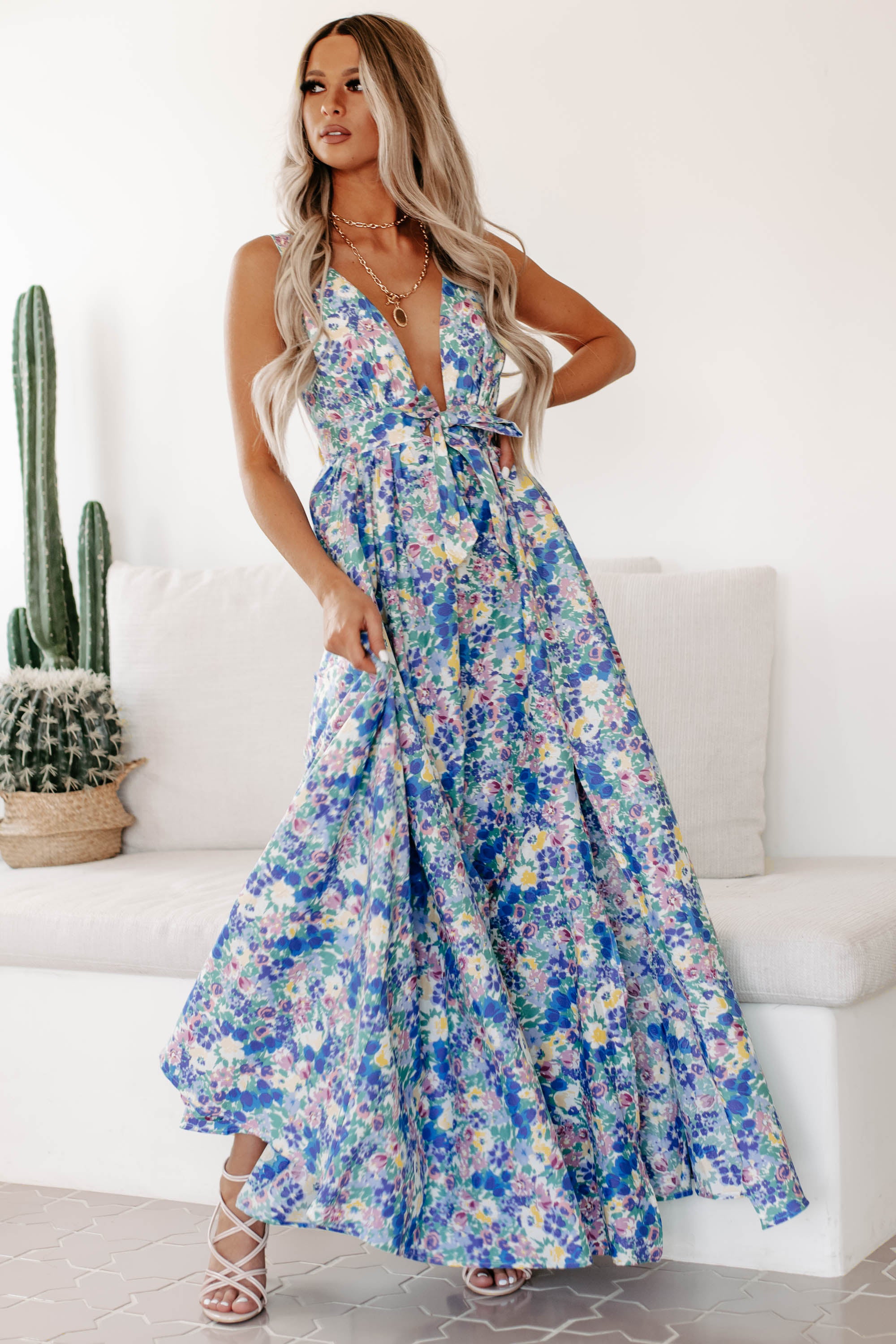 Devoted & Desired Tie-Waist Floral Maxi Dress (Blue/White) - NanaMacs