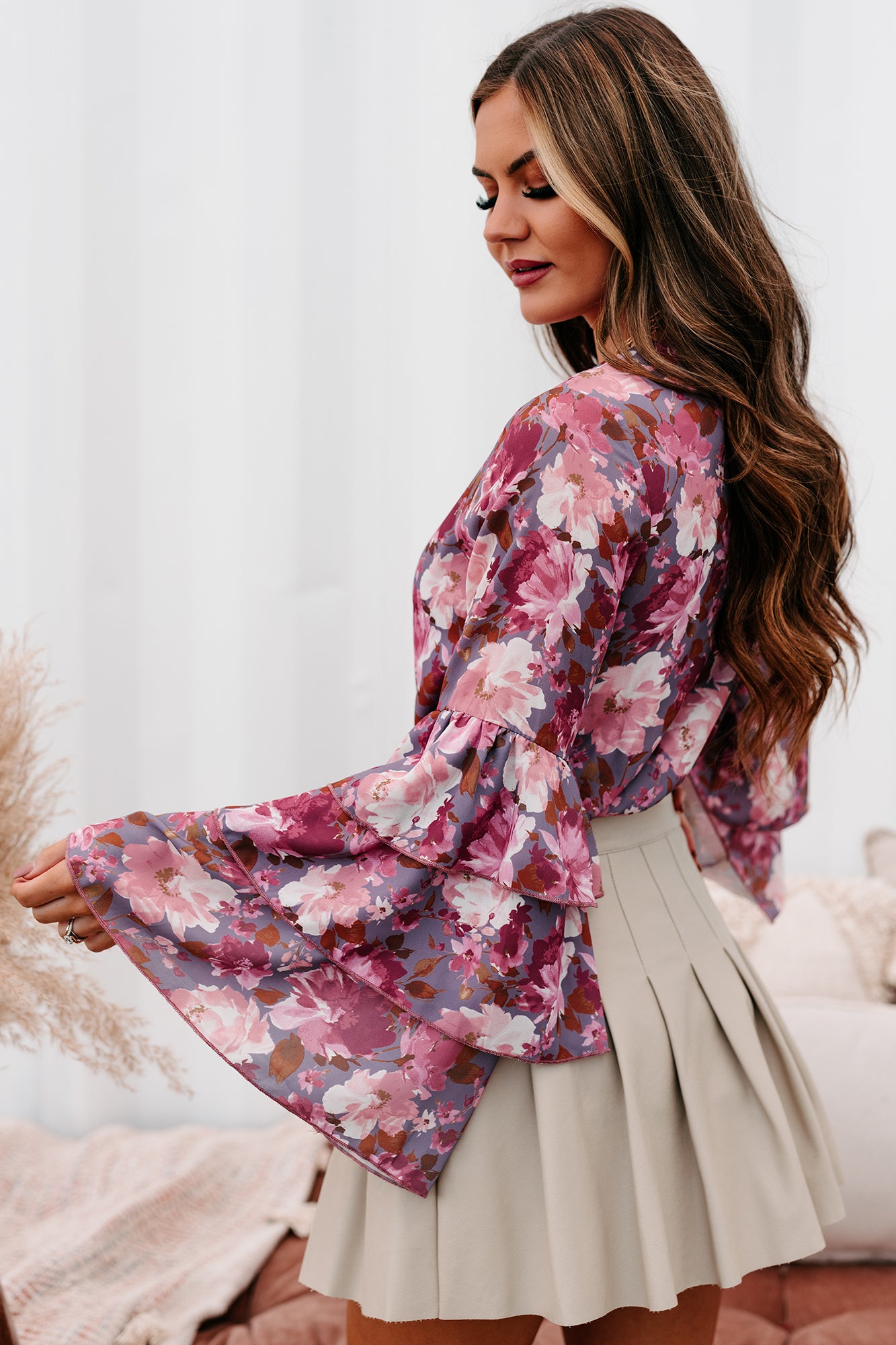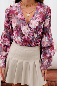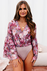 Dignified Grace Floral Ruffle Sleeve Bodysuit (Dark Purple/Mauve/Ivory)