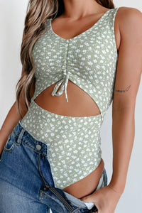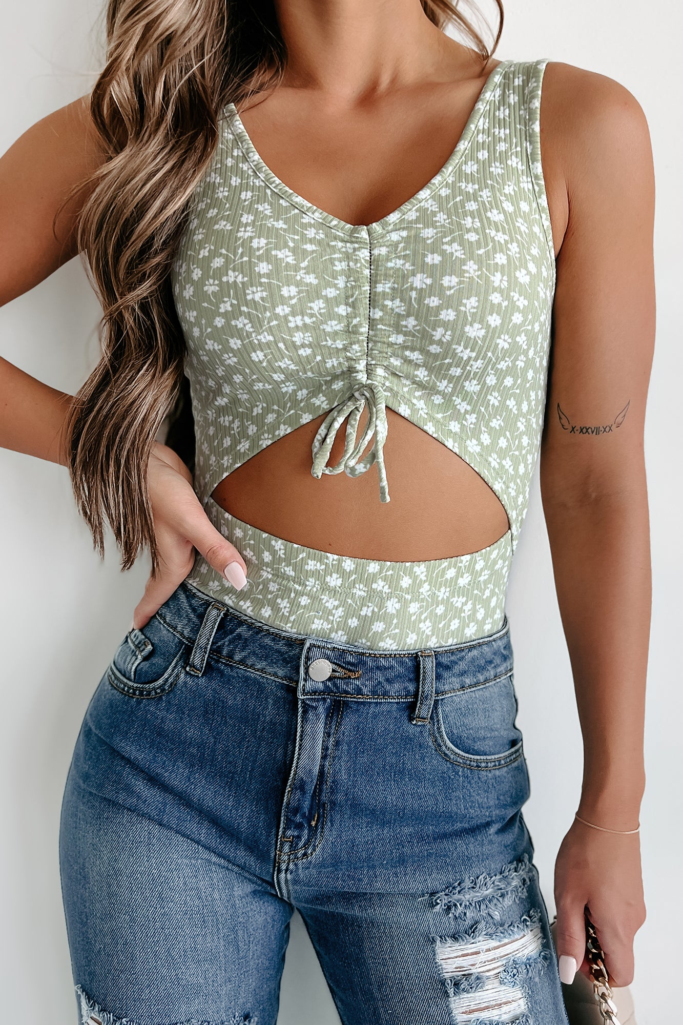 Doorbuster Seasonal Bloom Floral Ruched Cut-Out Bodysuit (Olive) - NanaMacs