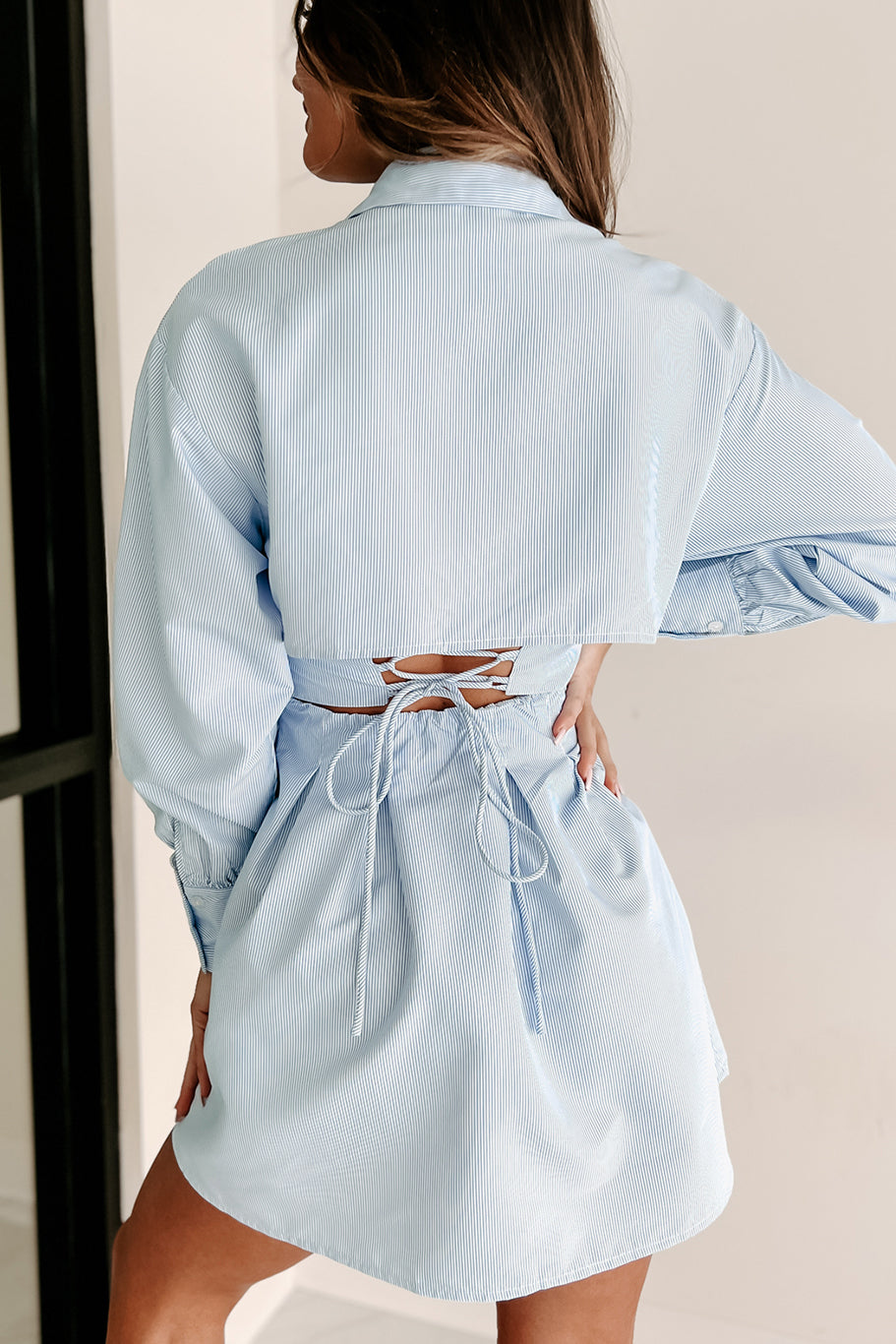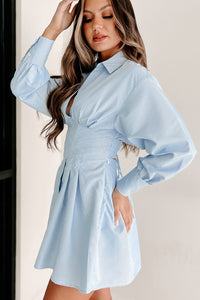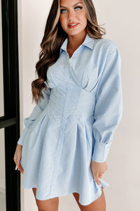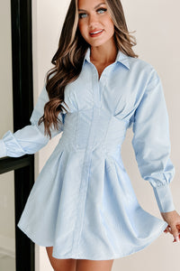 Refresh your wardrobe with a light blue and white striped shirt dress! The collared, V-neck design features long sleeves, pleated detailing, and a mini length - perfect for making an effortless fashion statement. A cut-out back & a faux corset waistline complete the look!