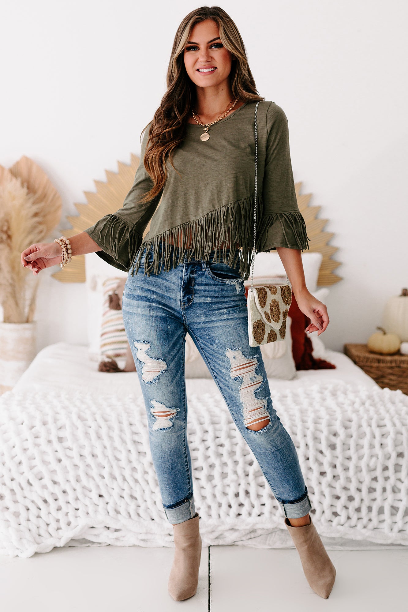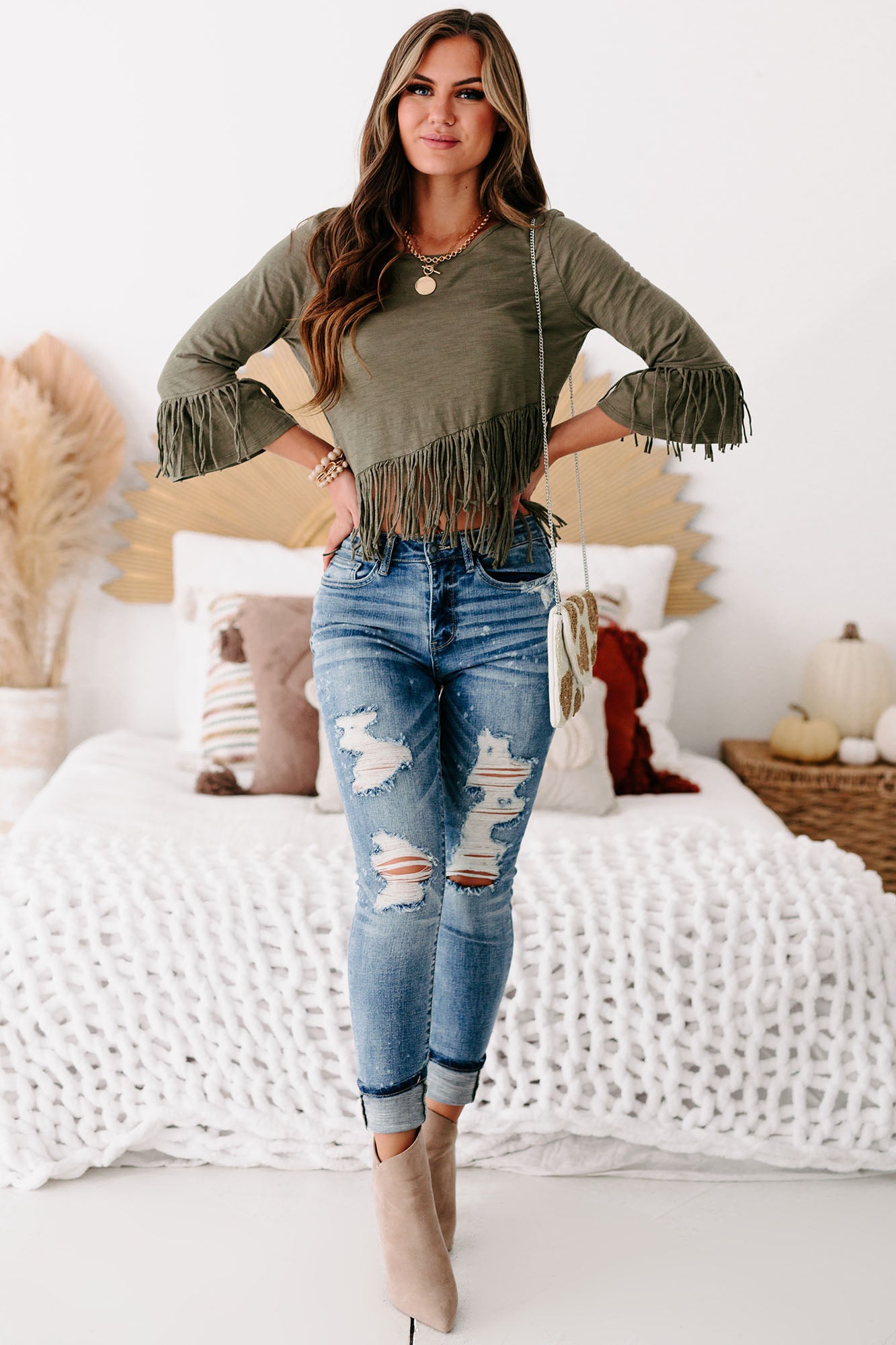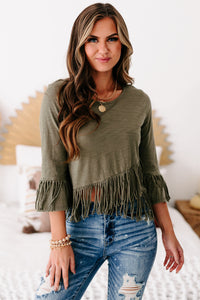 If Fringe Is Your Thing Then This Olive, Fringed, Cross-Over Crop Top Is For You! Hit " Add To Cart" Now!