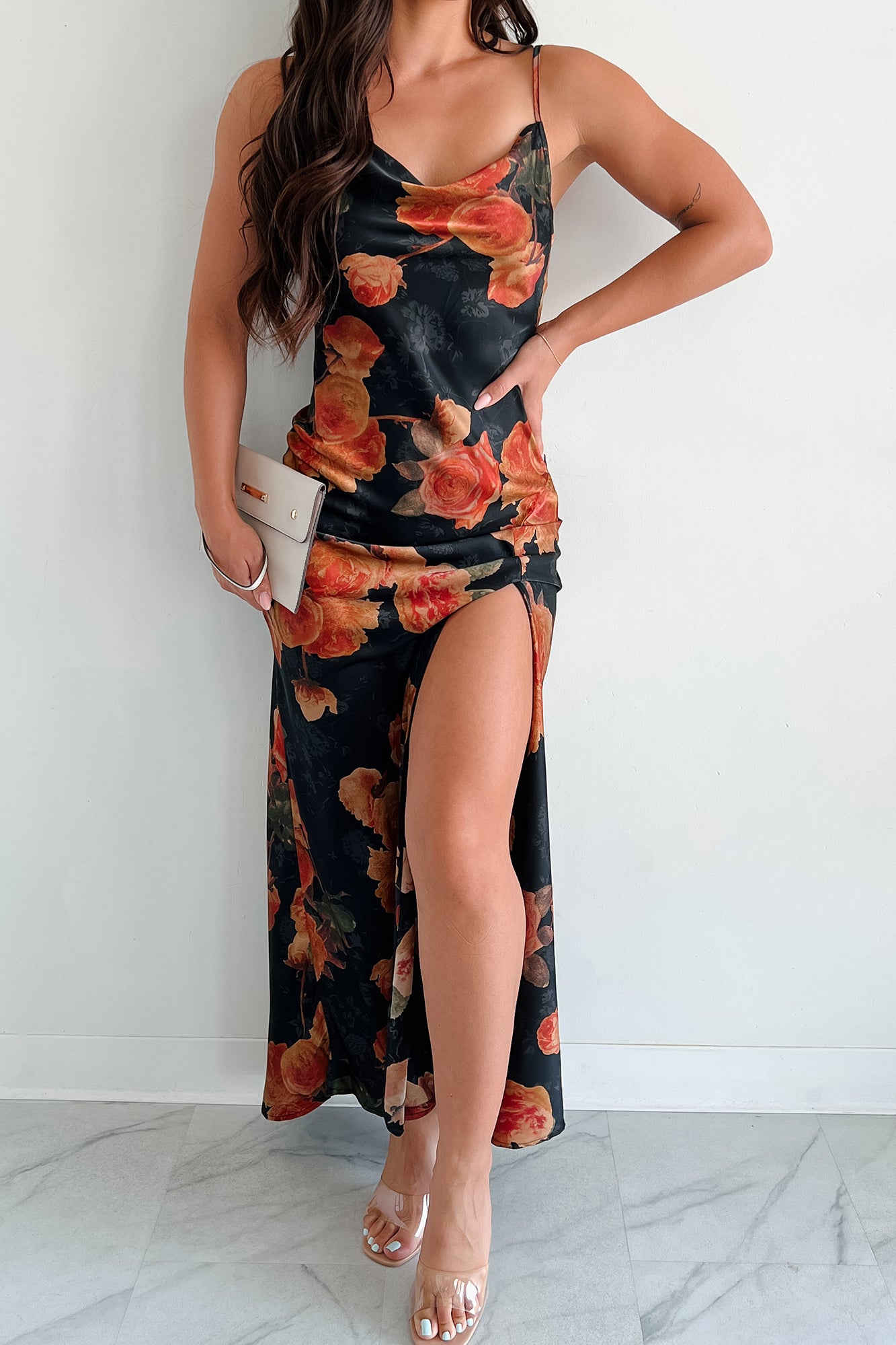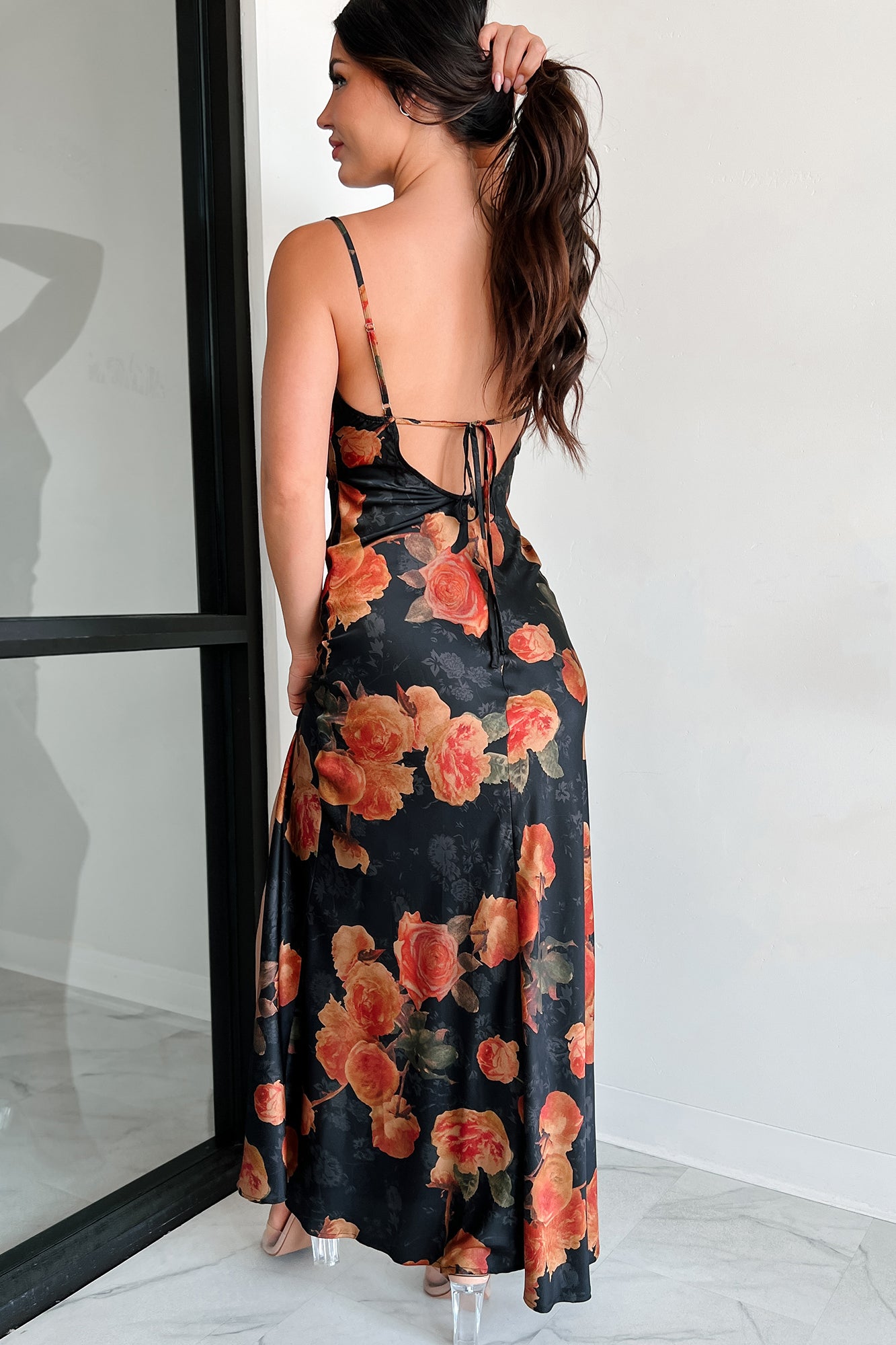 Exceptional Bliss Floral Satin Maxi Dress (Black)
