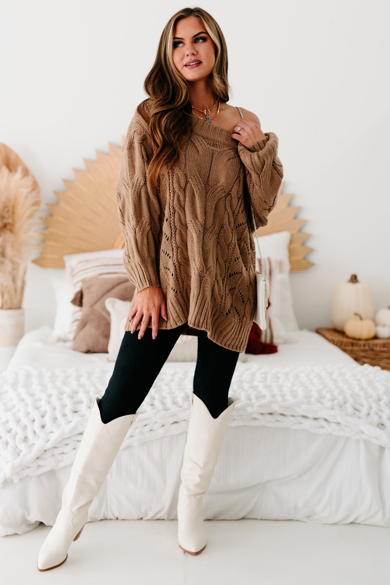 This Mocha, Cable Knit, Off The Shoulder Sweater Is Such A Closet Staple! You Know You Need This!
