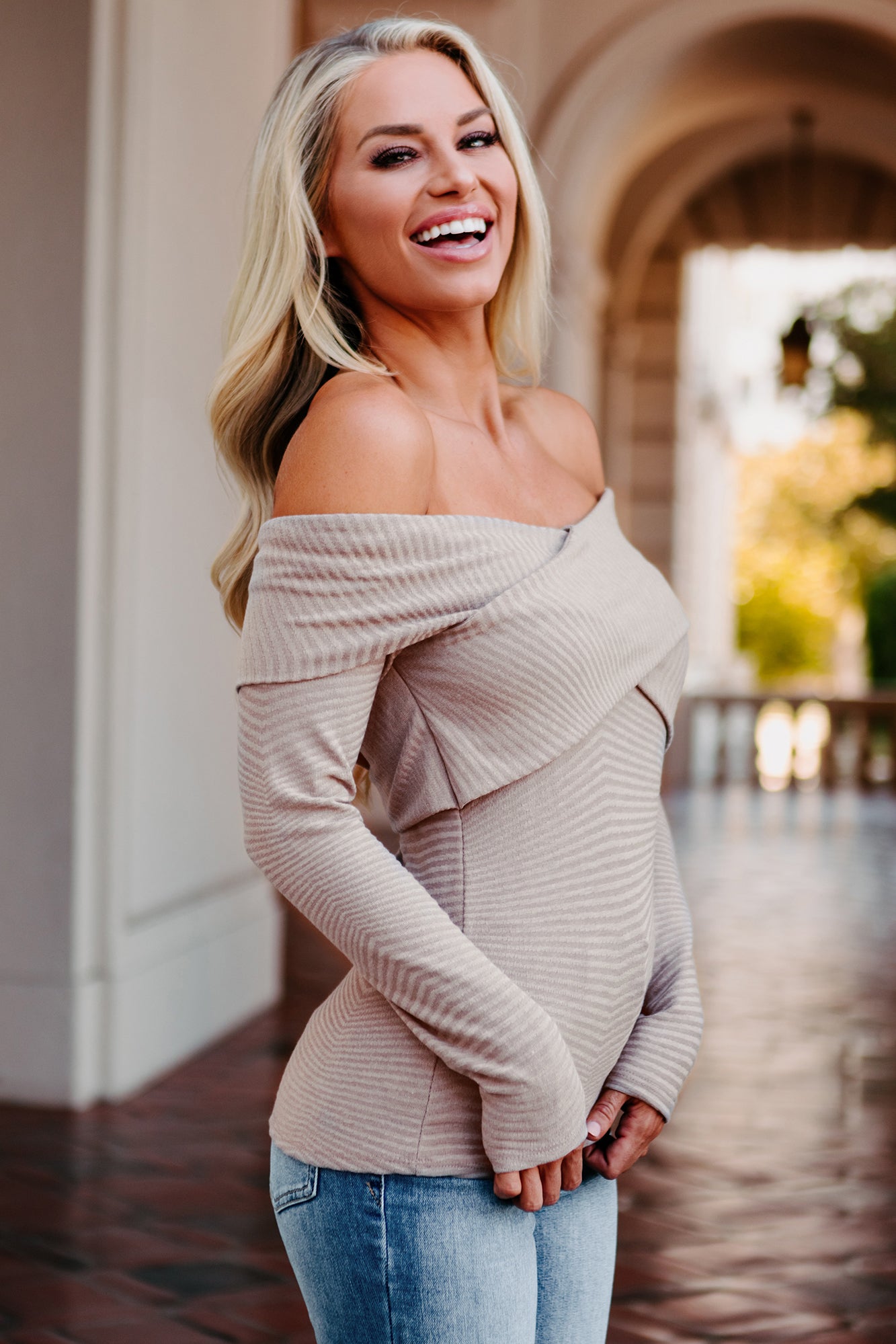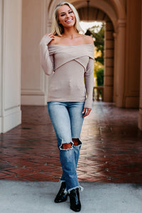 You'll adore this off-the-shoulder ribbed long sleeve top in mocha! The cross-front detail is so unique & chic!