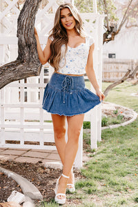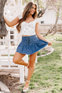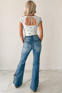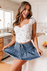 Flirty Flair Printed Cap Sleeve Top (White/Blue Floral)