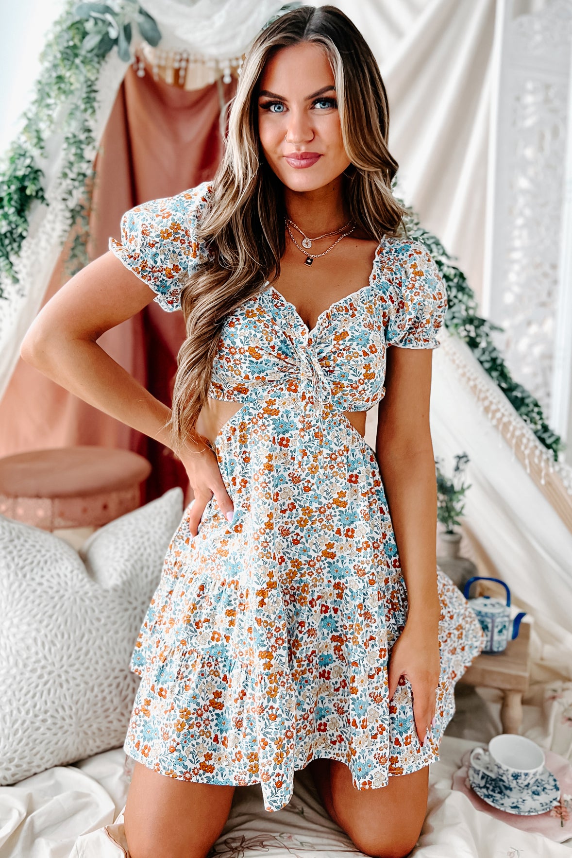 Fond Of Florals Cut-Out Floral Mini Dress (White/Blue/Orange) - NanaMacs