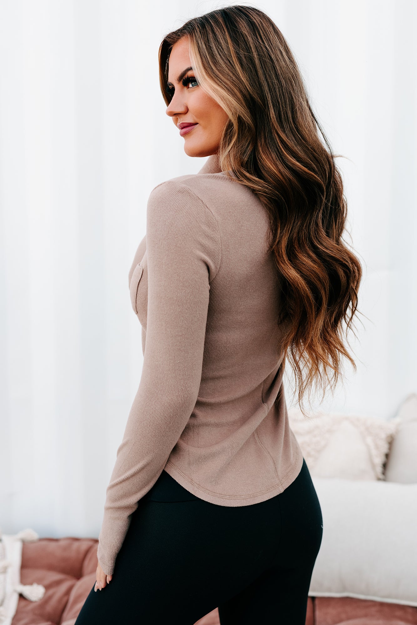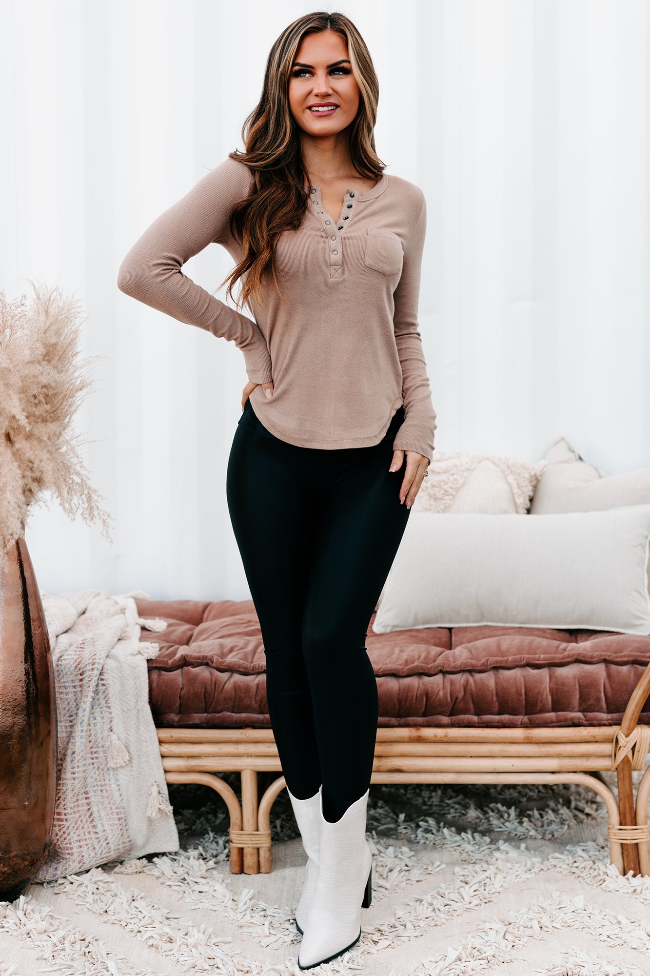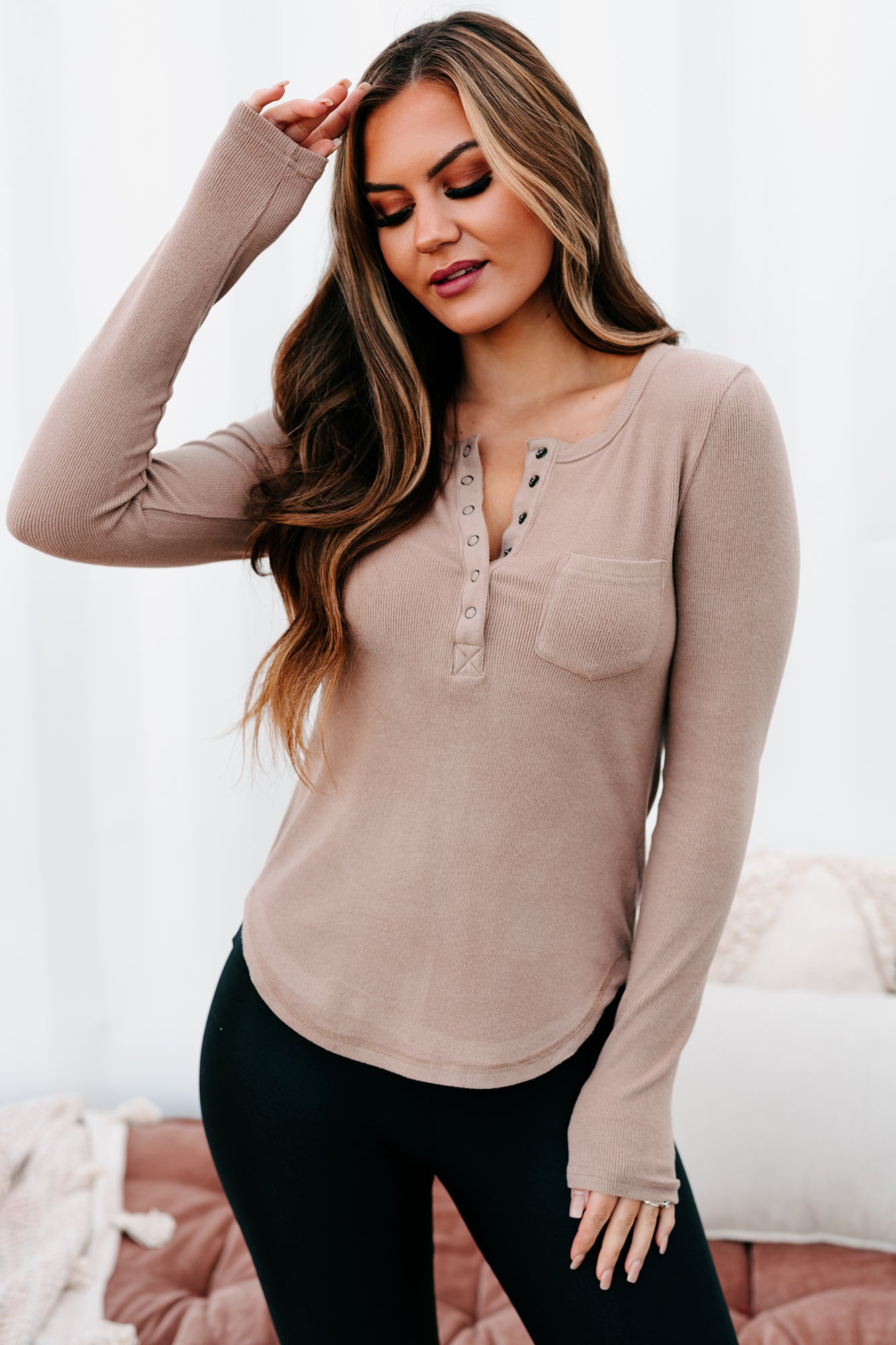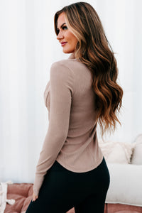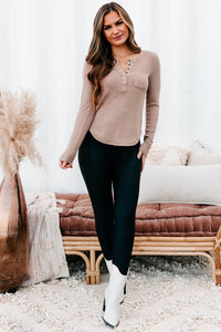 Fostering Friendships Ribbed Long Sleeve Henley Top (Taupe)