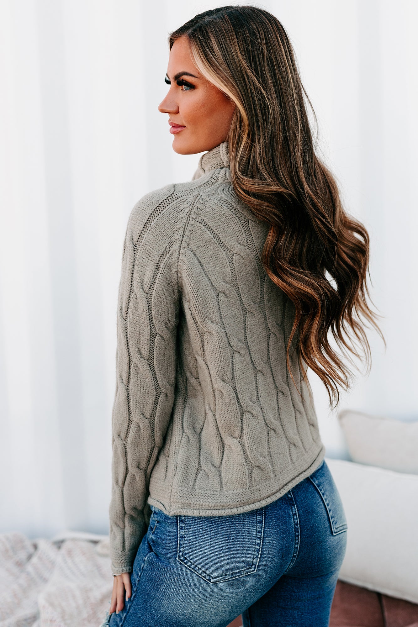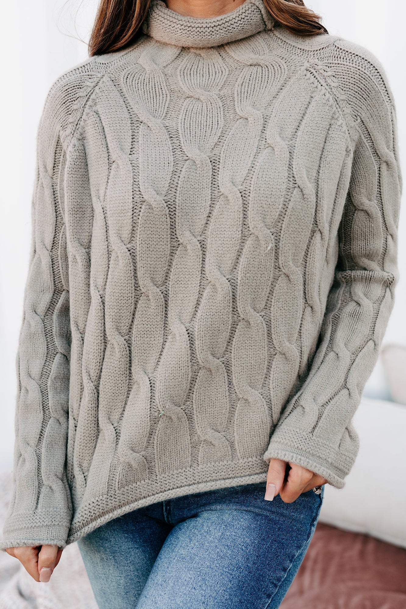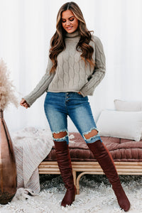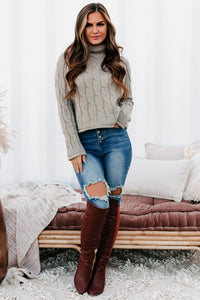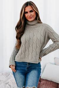 This Sage, Funnel/Turtle Neck, Cable Knit Sweater Is Sure To Keep You Warm & Cozy All Winter Long!