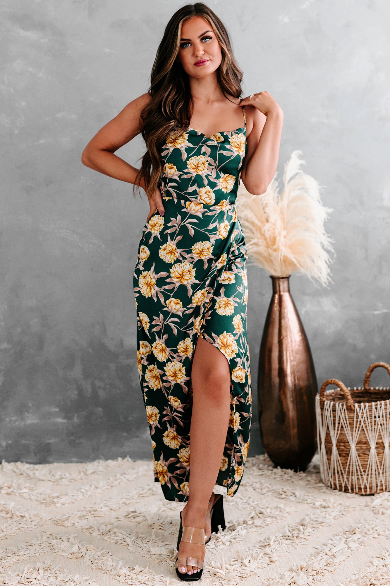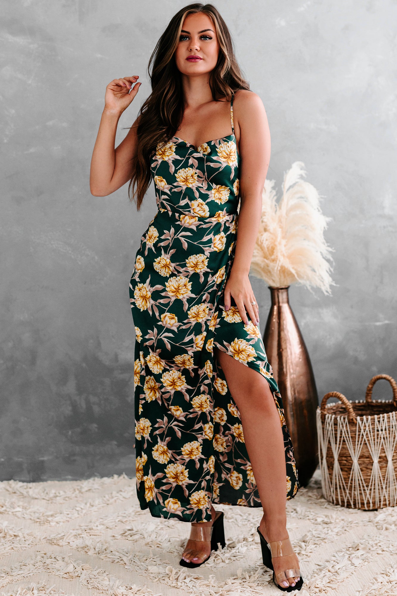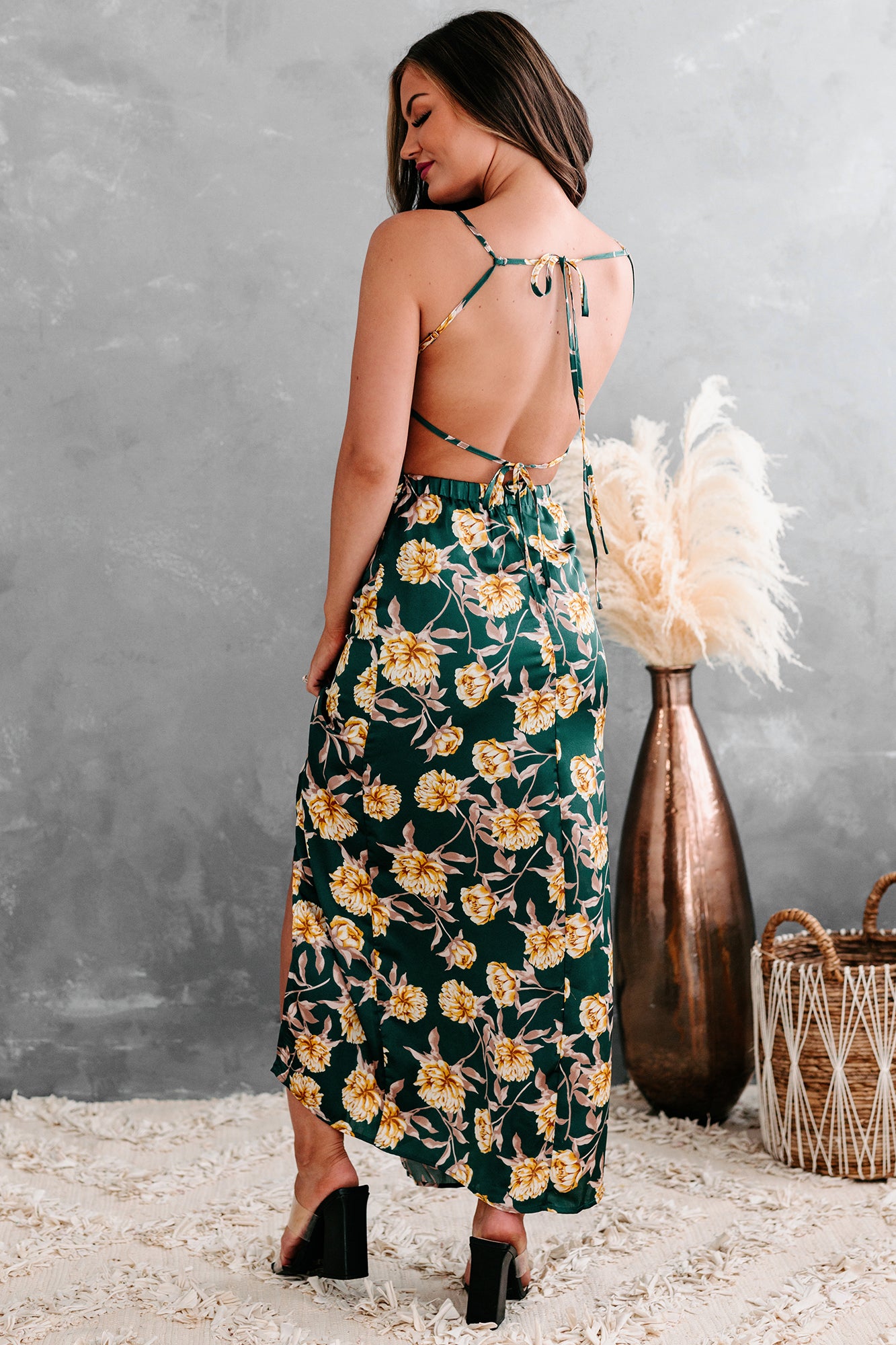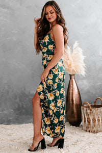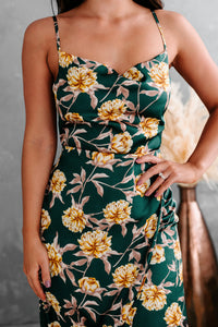 All of your dress dreams are about to come true with this satin tie-back, cowl neck, high-low, floral midi dress in hunter green!
