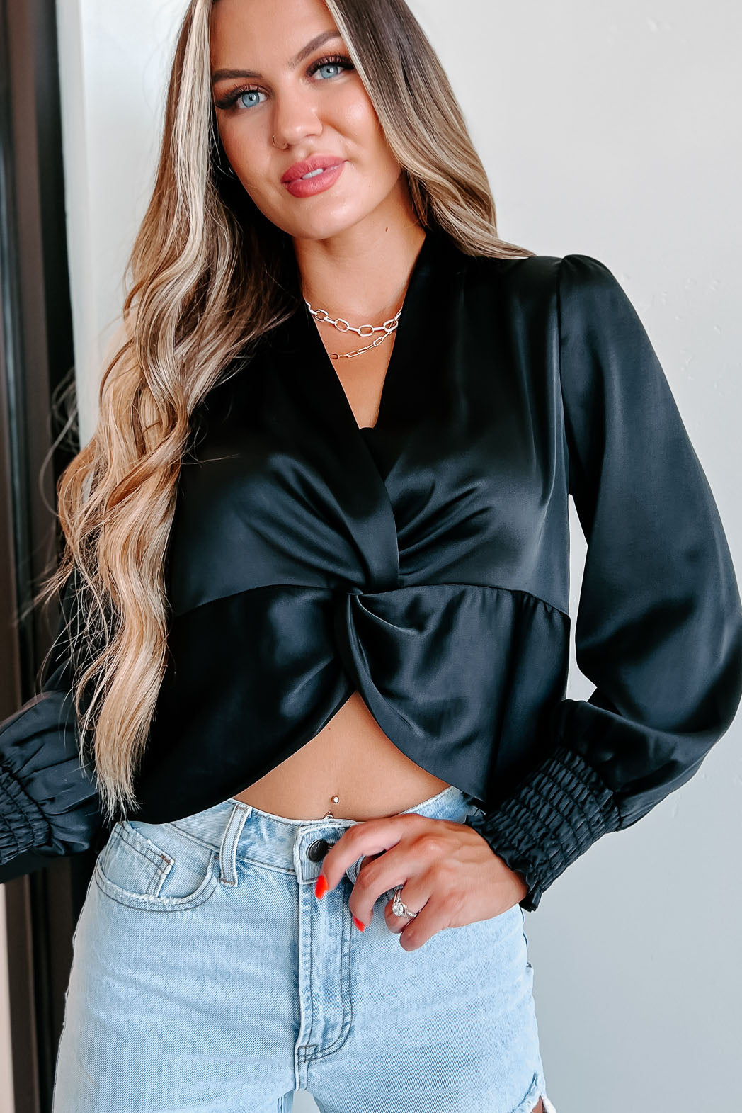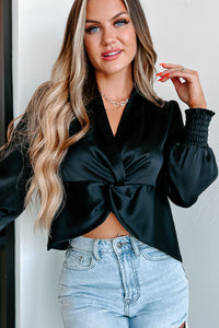 You're Gonna Love This Black, Long Sleeved, Twist-Front, Satin Top!