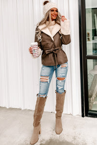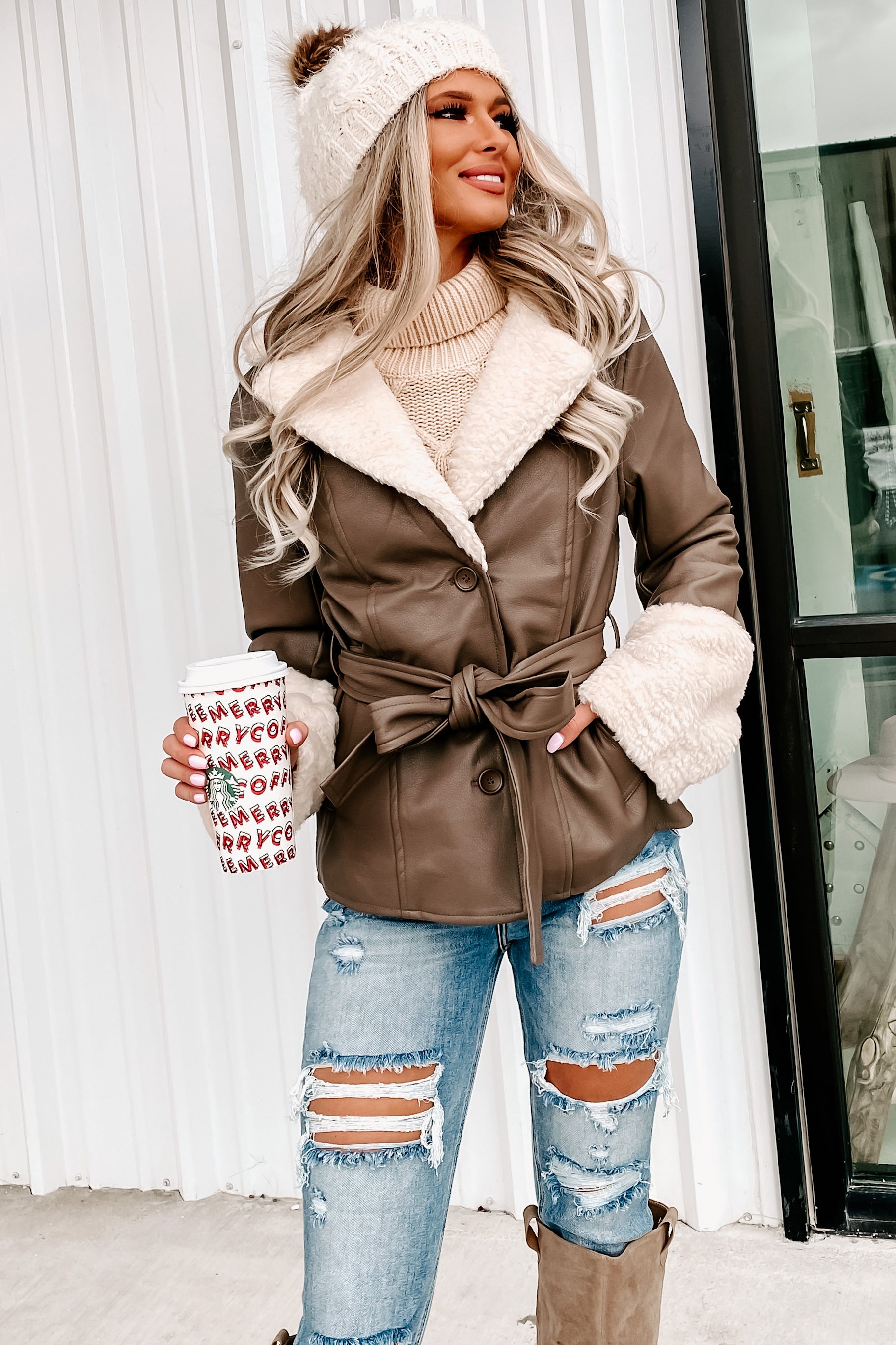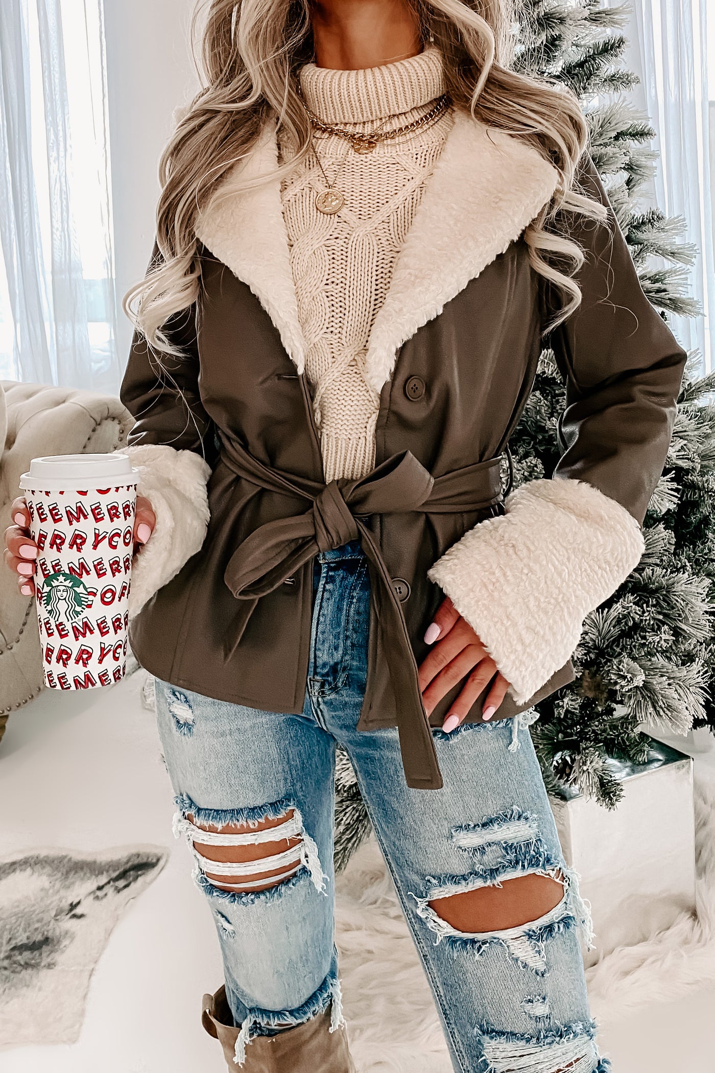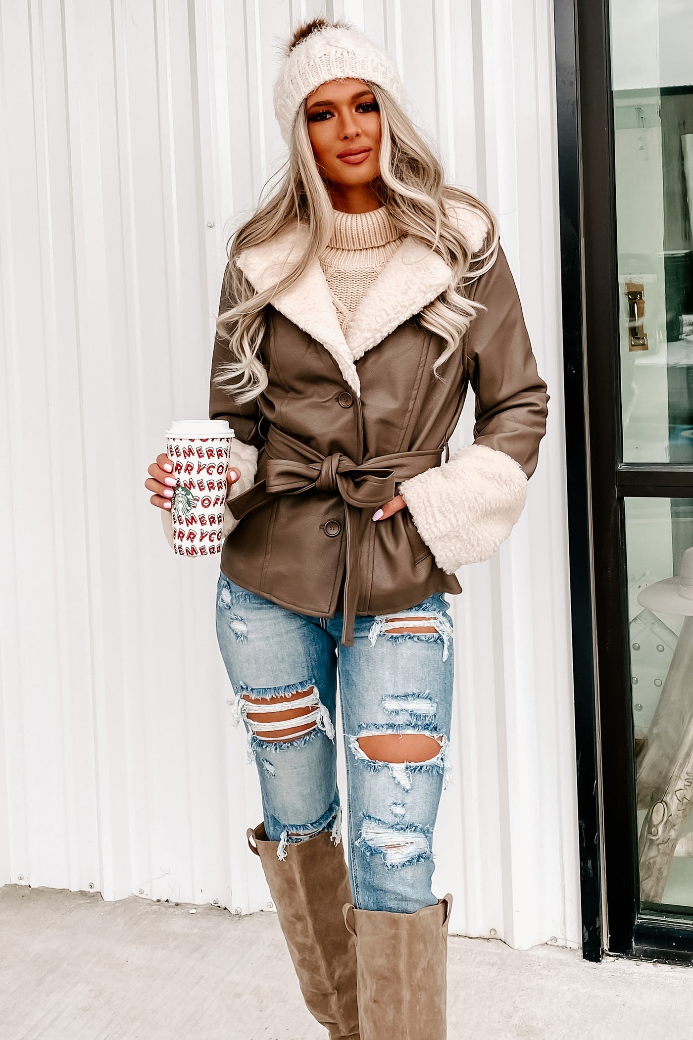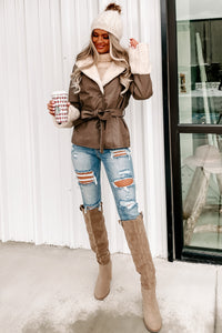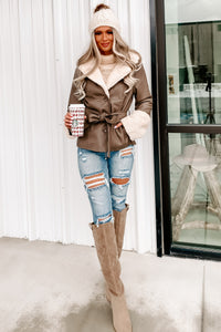 Stay Warm & Fashionable This Winter In This Dark Taupe, Sherpa Trimmed, Faux Leather Jacket!