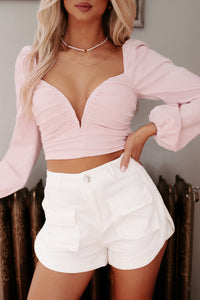 Look Effortlessly Graceful In This Crop Top! Long Sleeves Add Coverage While The Crop Length Shows Off Your Assets. The V-Neck Is Flirty And The Ruched Detail Will Make You Look Snatched!