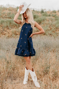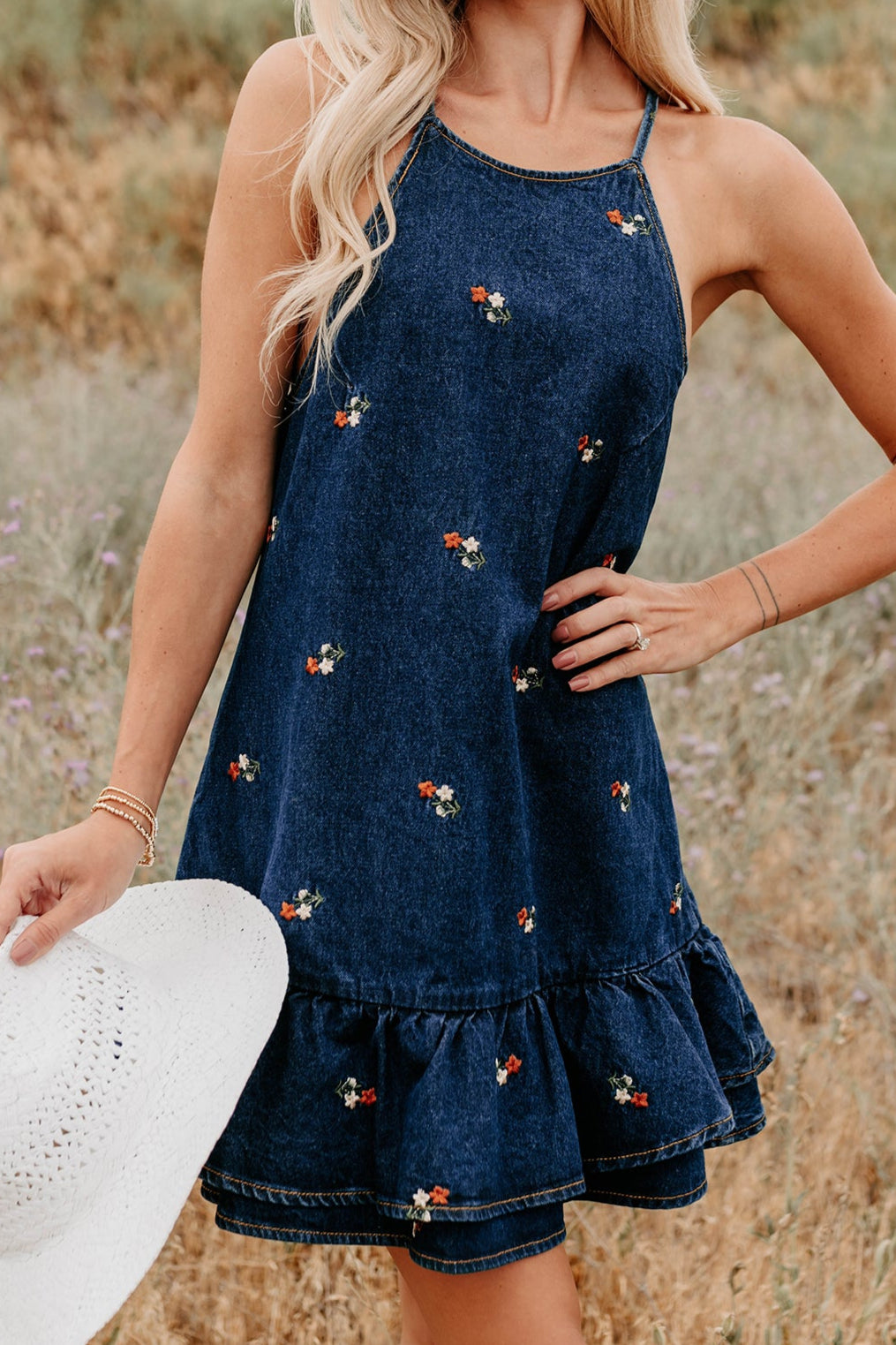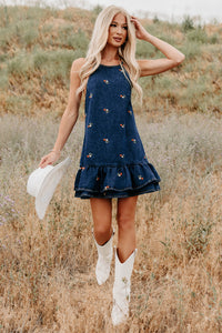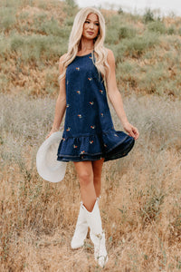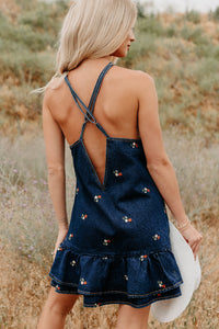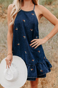 Graceful Grit Halter Floral Mini Dress (Dark Denim)