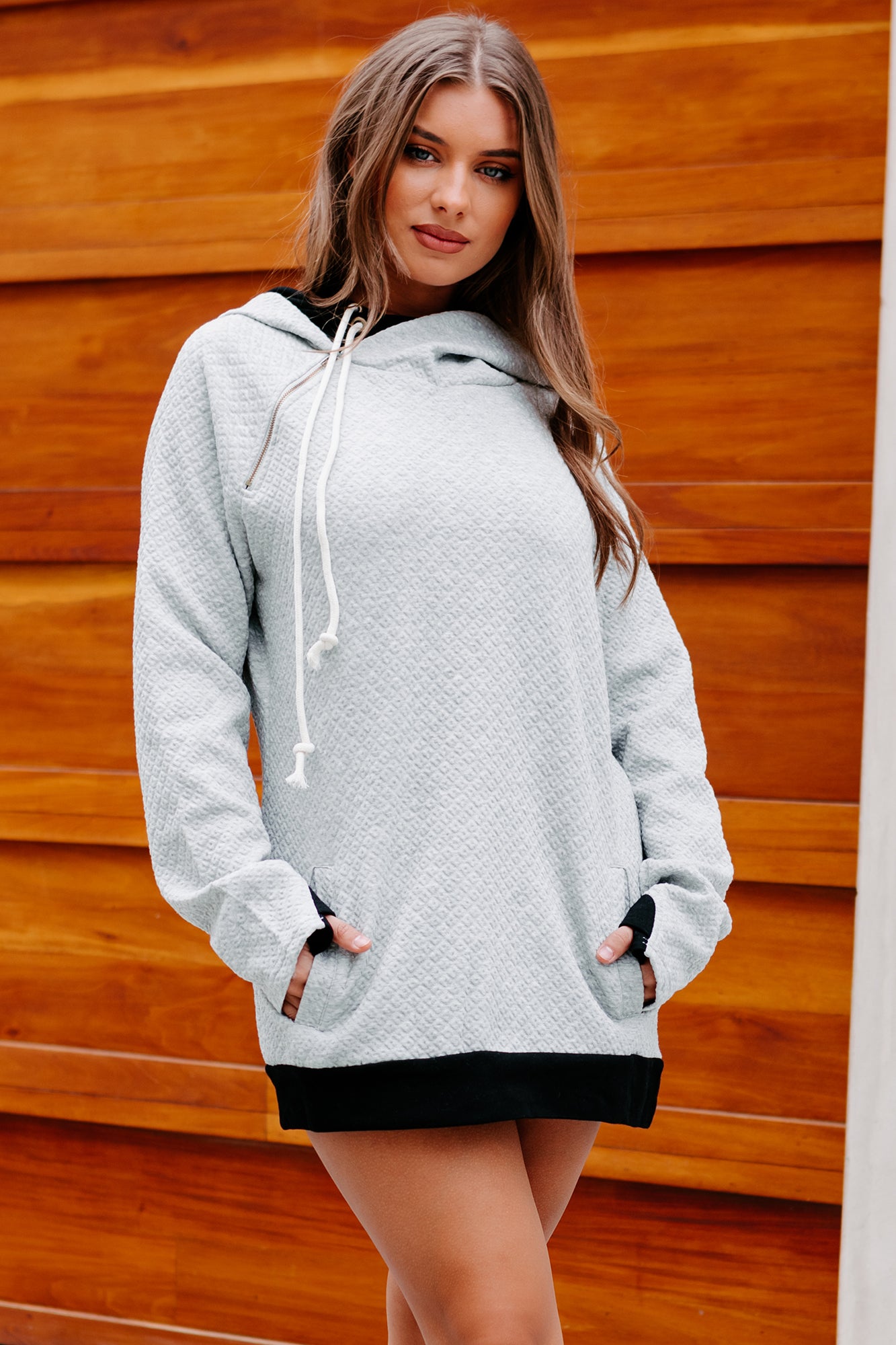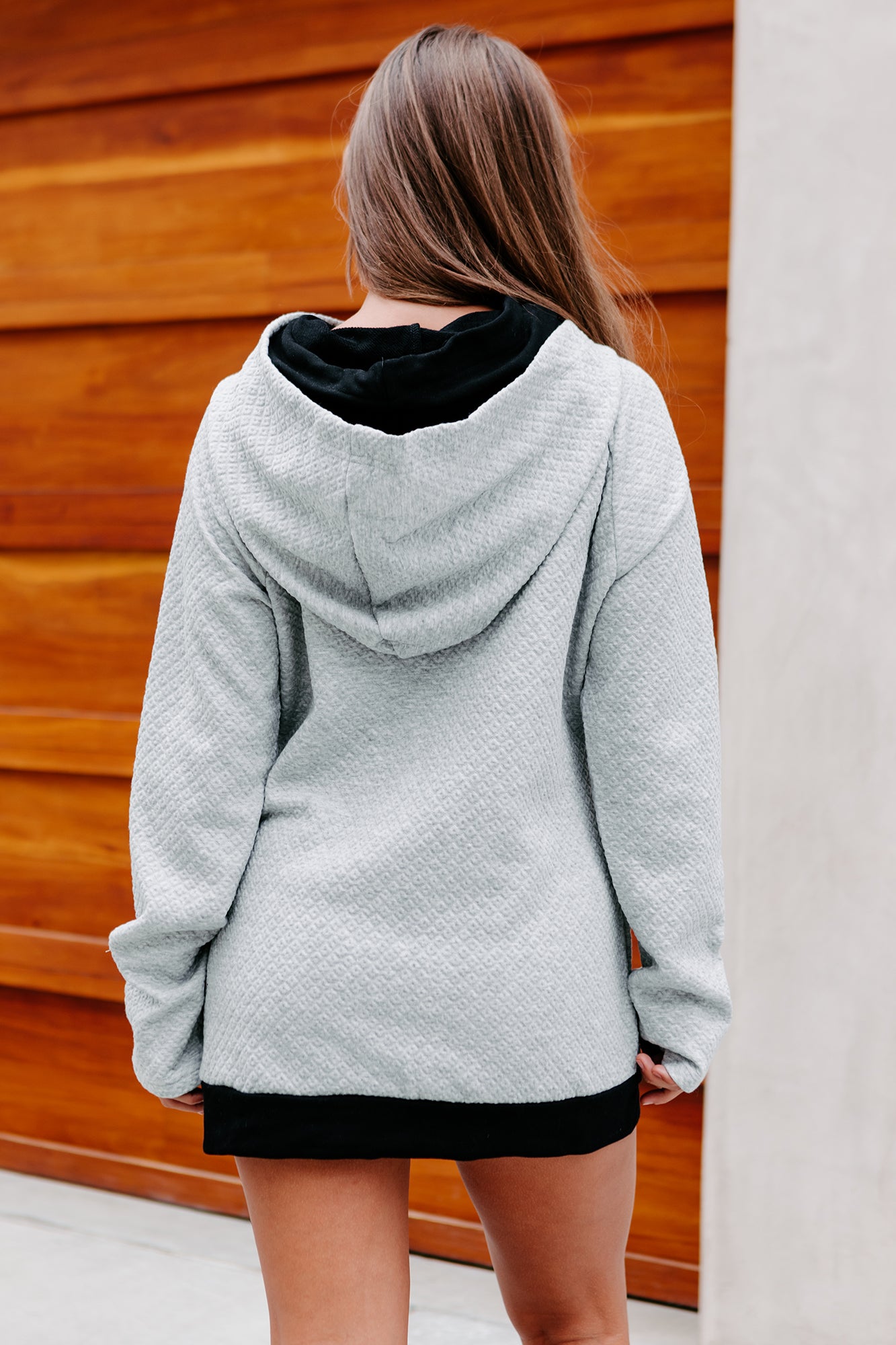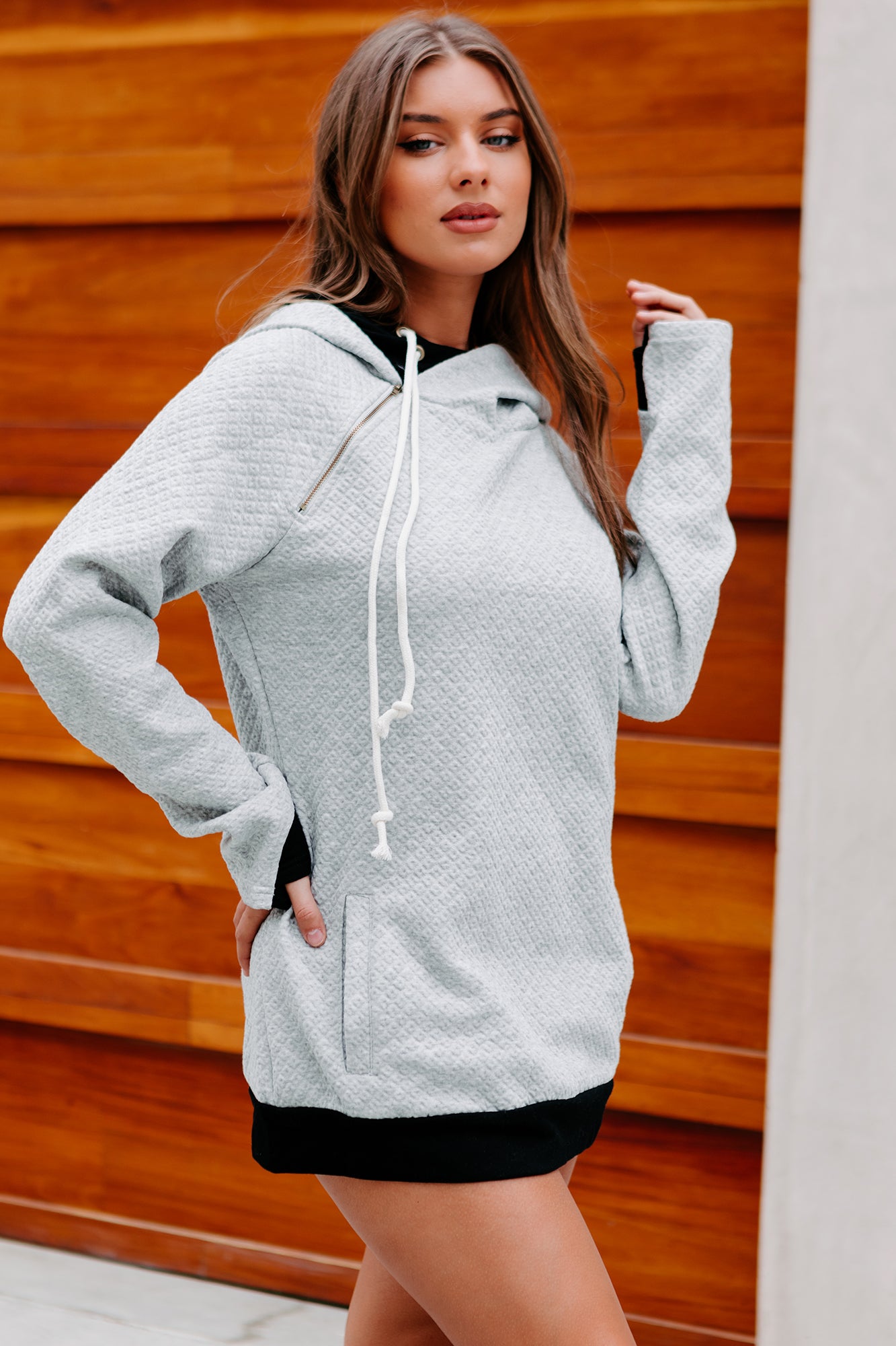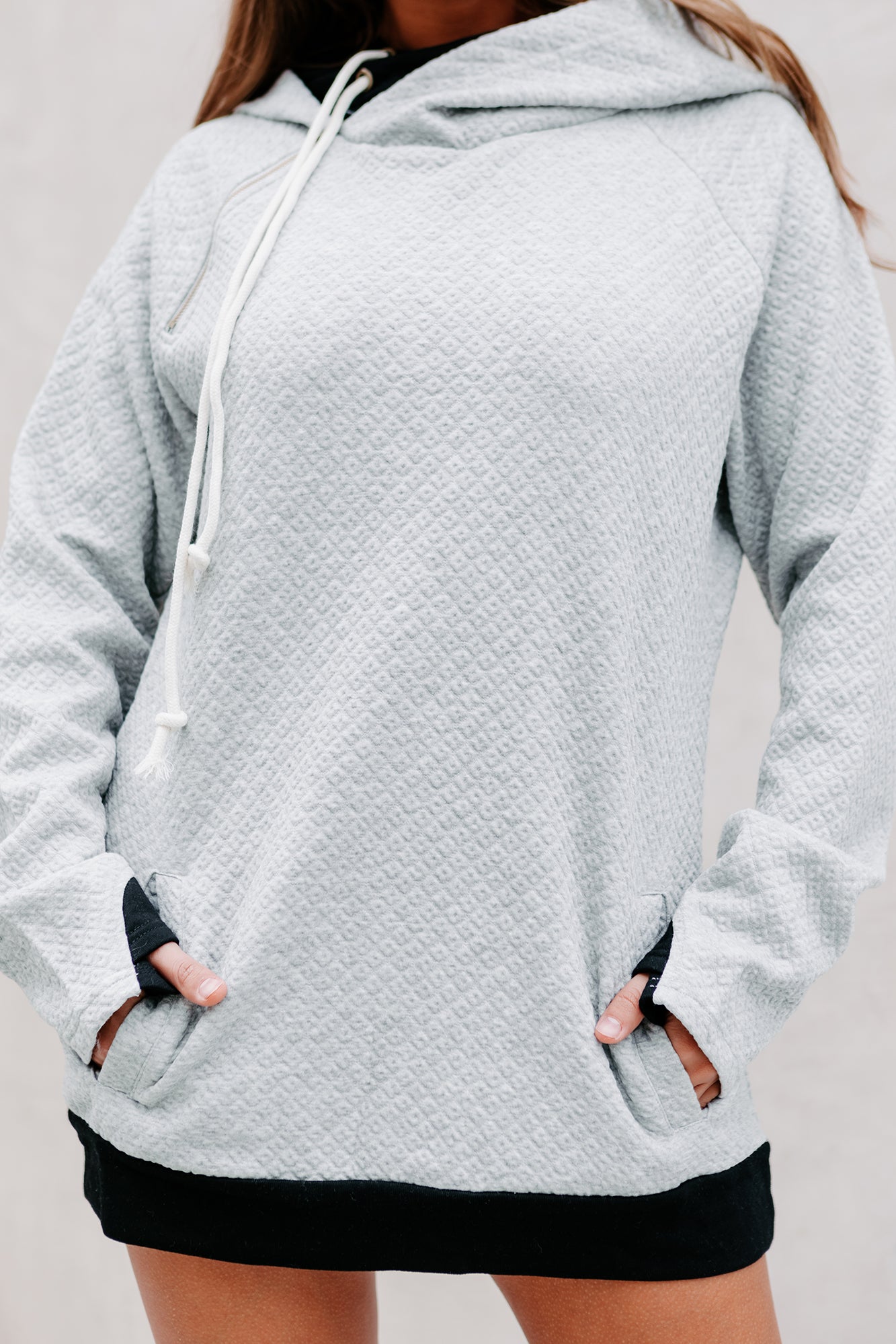 Everyone Needs A Nice Hoodie Like This Heather Grey, Color Blocked, Quilted Hoodie In Their Wardrobe!